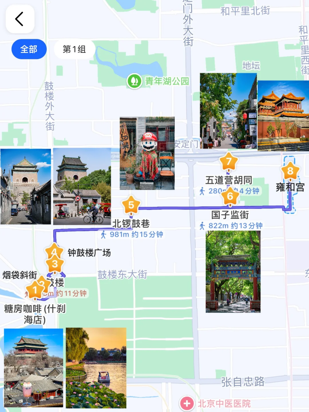 鼓楼➡️什刹海➡️炒豆胡同➡️东棉花胡同➡️南锣鼓巷➡️北锣鼓巷➡️分司厅胡同➡️方家胡同➡️国子监➡️箭厂胡同➡️五道营胡同➡️雍和宫➡️地坛公园