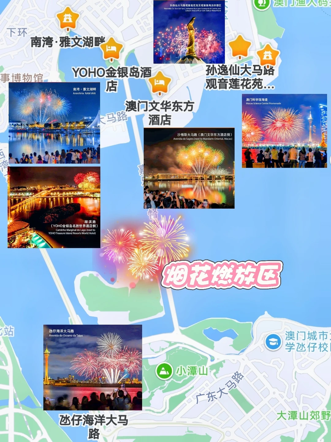 旅游万粉扶持计划 旅游编辑部 “倘若烟火是天空写下的情诗, 我愿与你并肩,读尽每一瞬绚烂。” 🎇 九月微风起,澳门国际烟花汇演如期而至 五天十场,漫天华彩如星河倾泻 澳门与珠海双城隔海相映 浪漫已悄然而至,你会如约而来吗? - ⏰烟花时间: 📆2025年9月6、13、20日(都是周六哦!) 📆2025年10月1、6日 🕘时间:每晚21:00、21:40各一场 📍主会场:澳门旅游塔对出海面 🎟费用:免费 - 🎇观赏点推荐: 🇲🇴澳门篇: ✓澳门旅游塔:旅游塔下的海边空地,烟花就在头顶绽放,很是震撼。 ✓冰仔海洋大马路:与旅游塔隔海相望,180度开阔视野 ✓澳门科学馆海堤:公交直达交通方便,还可看到澳凼大桥和横琴同框 ✓南湾•雅文湖畔 ✓主教山眺望台:俯瞰澳门半岛,旅游塔、西湾大桥与烟花同框,不过人少路远,不太推荐 🏙珠海篇: ✓十字门国际会展中心:距离烟花燃放区很近,且有较为充足停车位的地下停车场 ✓横琴国际金融中心:与十字门国际会展中心相对,如果发现风向不对,趁两场烟花的中间时间,可以立马开车换对面 ✓横琴大桥:视野开阔,但人很多 ✓加林山:摄影爱好者聚集地,可以从山上远眺澳门塔与烟花同框,不过这里需要长焦 - 📷游玩路线参考 澳门一日游:关闸➠ 大三巴➠ 澳门社会工作局➠ 澳门疯堂斜巷➠ 塔石艺文馆➠ 澳门欧洲研究学会➠ 加思兰花园➠ 主教山小堂 珠海一日游:日月贝➠ 野狸岛➠ 海燕桥牌坊➠ 香炉湾沙滩➠ 景山公园➠ 珠海渔女➠ 爱情邮局➠ 湾仔码头➠ 白石桥