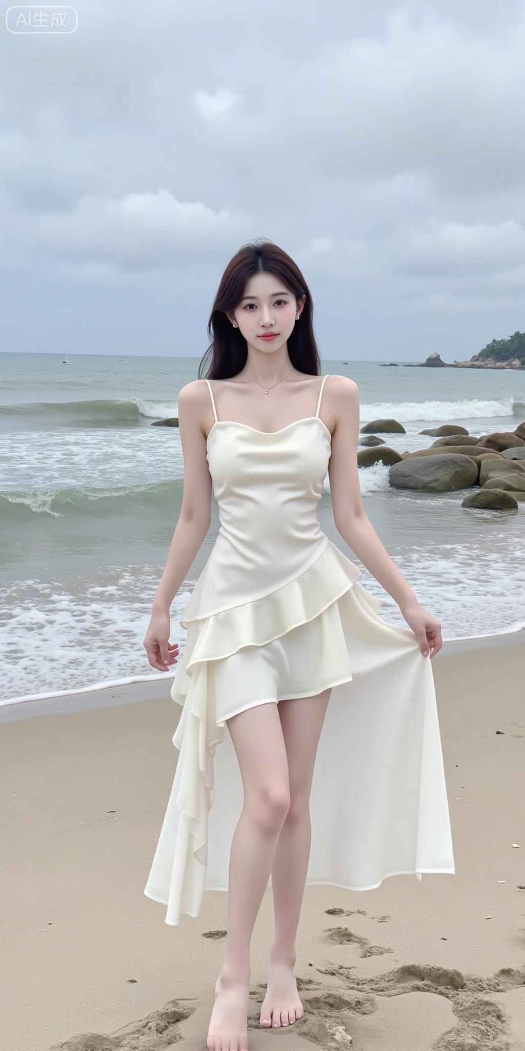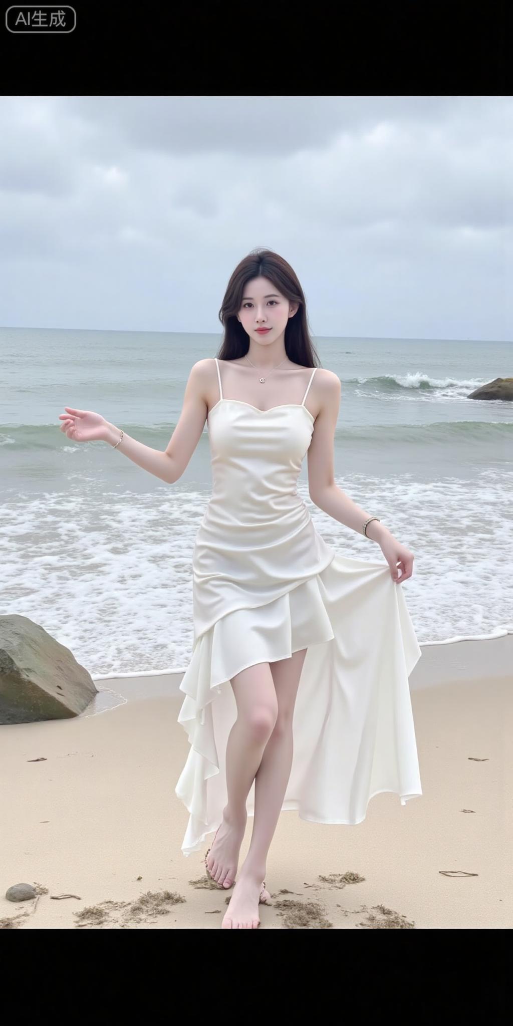 海滩甜妹,奶白缎面吊带裙,温柔纯欲氛围感拉满温柔风吊带长裙 甜酷吊带裙 纯欲白吊带少女