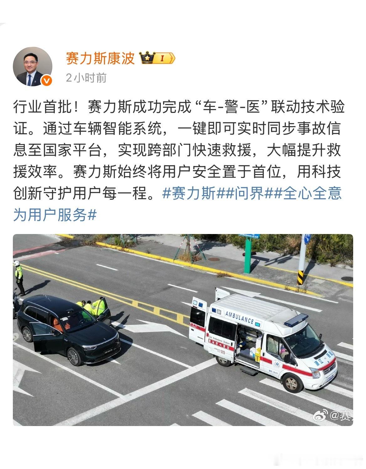 又一个汽车智能化改变我们生活的案例,行业首批“车-警-医”联动技术已经由赛力斯验证完成。一键即可实时同步事故信息到国家平台,实现跨部门快速救援,大幅度提升救援效率。