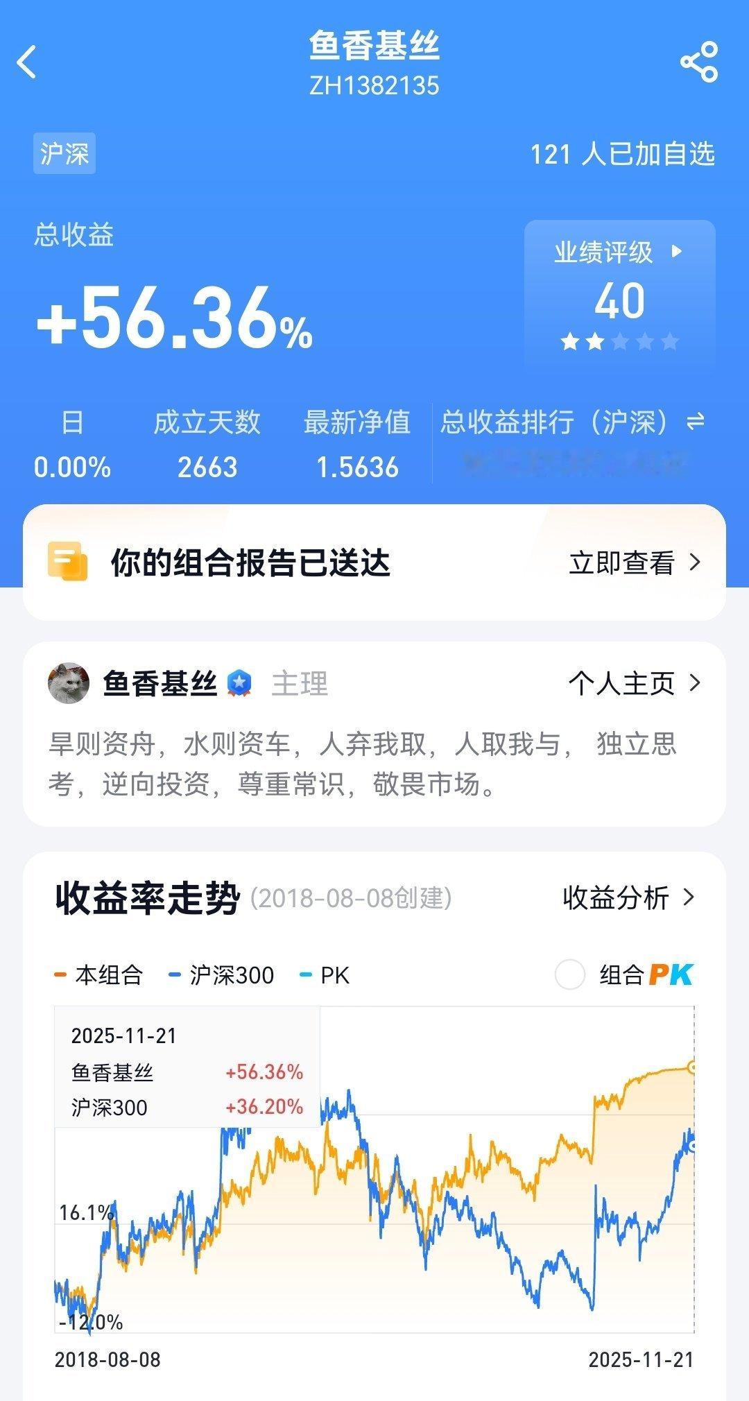 空仓躲大跌,2025年11月21日鱼香基丝指数基金投资组合实盘周报成立以来场外组合收益率18.1%,场内组合56.3%,跑赢同期沪深300指数29个百分点。现在组合依旧空仓,全部在货币基金里。最近股市暴跌,我空仓躲过大跌,跑赢沪深300指数更大。虽然大跌,但现在沪深300指数pe近十年百分位为80%,依旧处于历史高位,所以股市还有很大的下跌空间。远离,看戏。耐心是最珍贵的投资品质。尊重常识,敬畏市场。投资a股股票 $上证指数 sh000001$ $沪深300 sh000300$ $创业板指 sz399006$