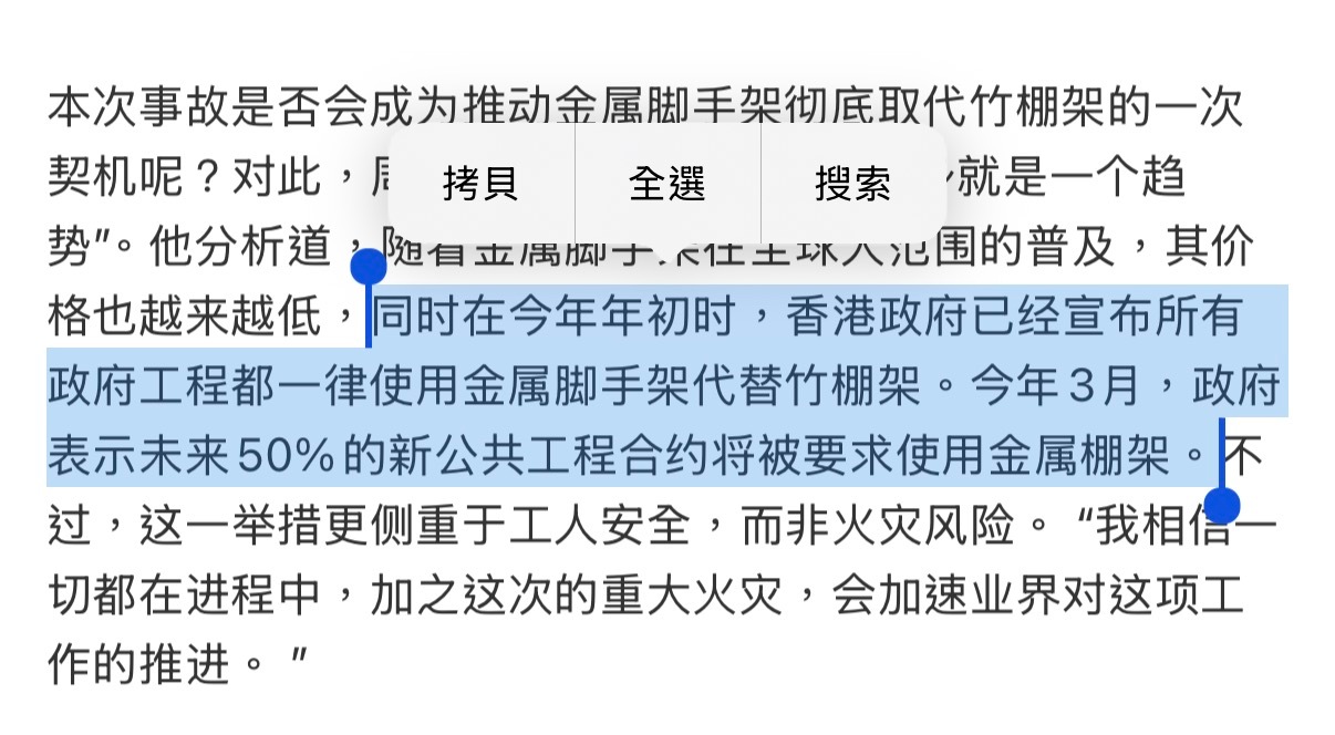 现代和传统的平衡点需要挪一挪。香港是一座现代化极高的城市,但在建造方面还在使用着传统的竹脚架。我觉得就这点,他们肯定也是知道的,不能单纯因为成本问题而忽略了安全第一。所以,在今年年初的时候,香港政府已经宣布所有政府工程都一律使用金属脚手架代替竹棚架。这次更像是被钻了个漏洞,或者说看到了不得不完善的一个点,那就是未来竹脚架必然要一点一点替代掉。但要及时作出调整确实也不是容易的事。在香港,私人楼宇的工程量占据市场大头,比如这次香港火灾事发地点的楼栋必然是私人承办,使用竹脚架对于他们而言是合规的,且政策覆盖不到这里,就等于把最大的风险点留了下来。换句话说,政府工程只是个小头,真正的难点就在于怎么让私营市场也愿意转。这里面其实还有一个矛盾,那就是竹棚架目前确实比金属架灵活,特别是在香港这种高楼密集、空间有限的地方,搭起来快,转角处理也方便。加上熟练的扎作师傅一天能搭出几十平米,工期就是金钱,对于香港的工价来说,这钱省下来就是利润。所以光靠呼吁和自觉肯定不行,下一步要么是提高竹棚架的合规成本,要么是降低金属架的使用门槛。比如强制要求私人工程超过一定高度或面积必须限时整改,或者像之前推广安全带那样,给金属架租赁补贴、简化审批流程。至于那些扎作师傅,他们的手艺不能就这么丢了。有些人干了三四十年,突然说转行就转行不现实。更好的做法是把部分技能转化,比如金属架的搭建规范、安全验收等…香港要的不光是拆掉竹棚,而是把这门手艺用更安全的方式留下来。说到底,这次事件也让所有人看到,传统和现代的平衡点,该挪一挪了。香港业内人士回应竹棚架使用质疑