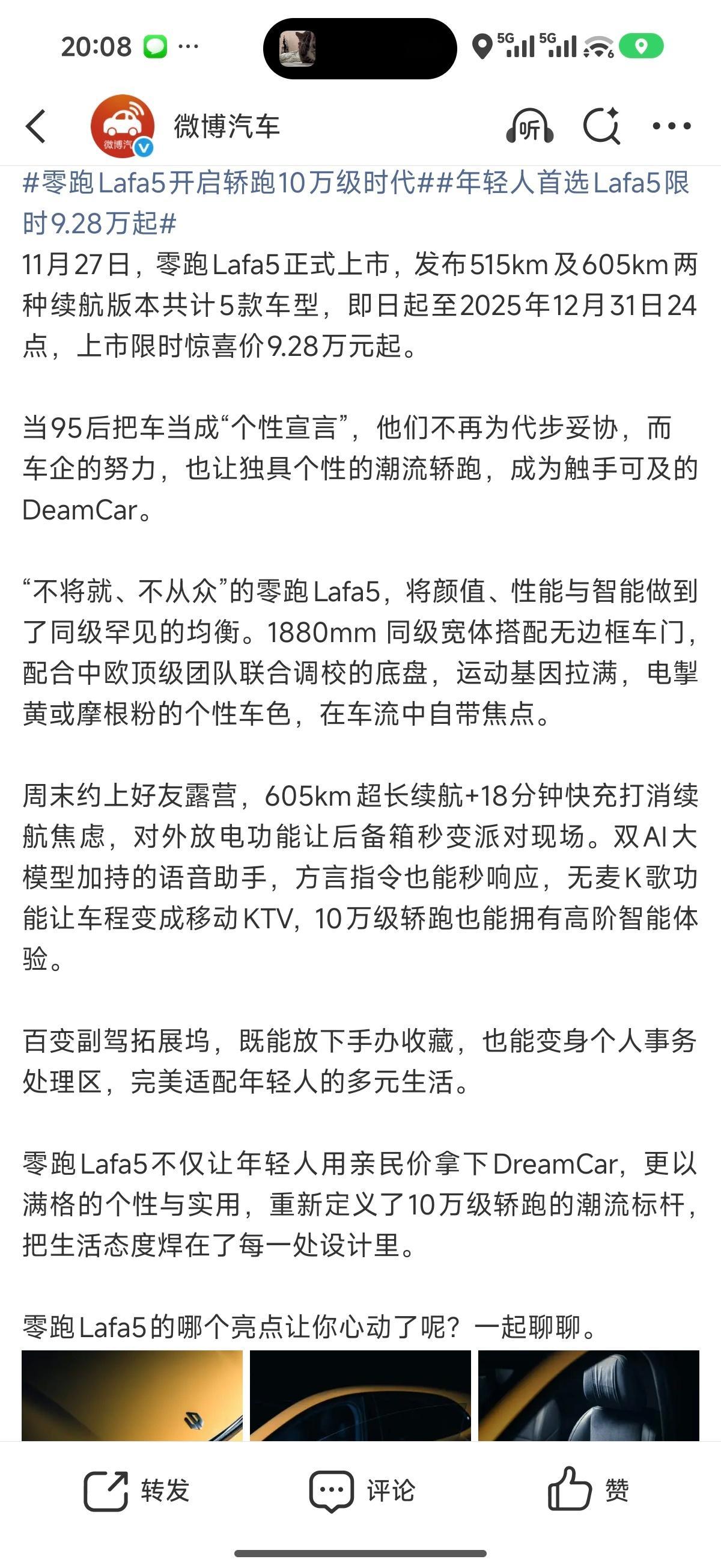 年轻人首选Lafa5限时9.28万起 零跑还是有跑车梦的10万级预算能拿下无框车门+后置后驱轿跑,零跑直接把豪华配置拉到平民价位了1880mm同级最宽车身+低趴姿态,颜值不低;6.4秒零百加速+50:50轴荷比,过弯灵活不飘,驾驶乐趣不输20万级车型。更狠的是全系标配800V快充,18分钟补能30%-80%,5分钟回血200km,基本没有续航焦虑高通8295芯片车机丝滑到飞起,2735mm轴距+1400L拓展后备箱,个性和实用居然不冲突!605Pro版才12.18万,满配核心配置,堪称性价比之王以前觉得轿跑是年轻人的“遥不可及”,现在零跑Lafa5让“第一台轿跑梦”触手可及。零跑Lafa5开启轿跑10万级时代