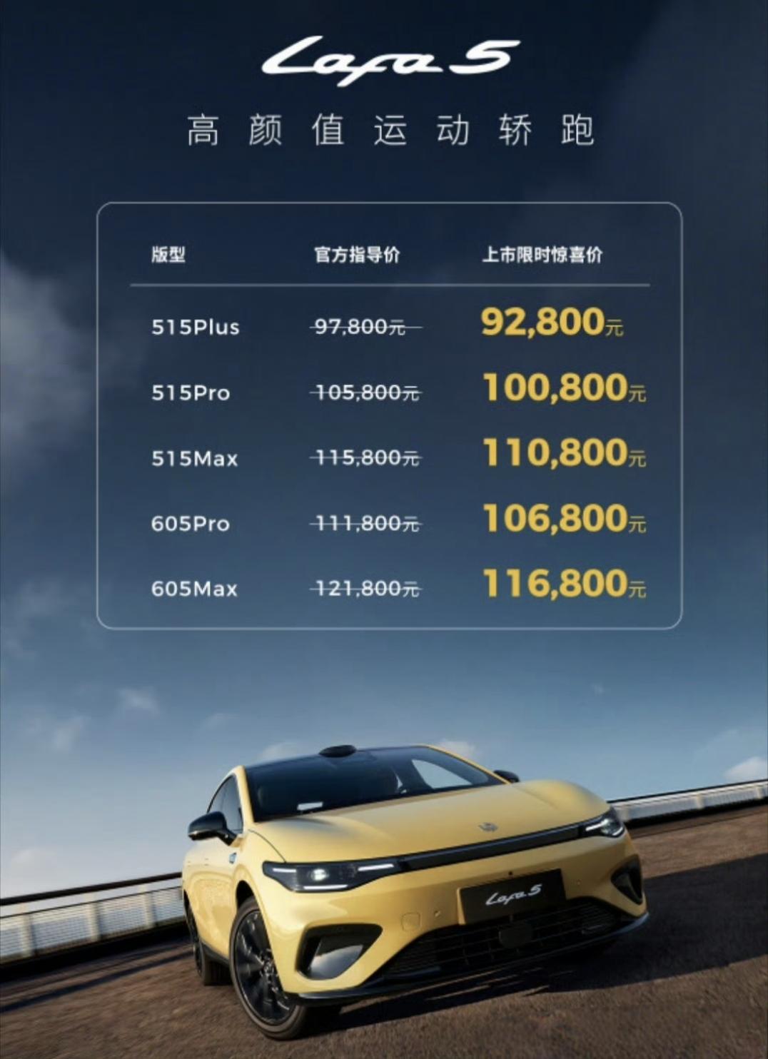 零跑Lafa5开启轿跑10万级时代 零跑lafa5这个价格,果然还是以成本定价,挺实惠的,并不贵。 共有5个版本: 515 Plus 售价9.28万 515 Pro 售价10.08万 515 Max 售价11.08万 605 Pro 售价10.68万 605 Max 售价11.68万 其中Max版本是带激光雷达的,座舱是8295芯片,未来有升级高阶智驾的能力。 而Pro和Plus版本是8155座舱芯片,只有普通的辅助驾驶。 其实Lafa5这个车挺适合改装的,这么好看的形状,定个黄色,改成敞篷的,很拉风。【来自懂车帝车友圈】