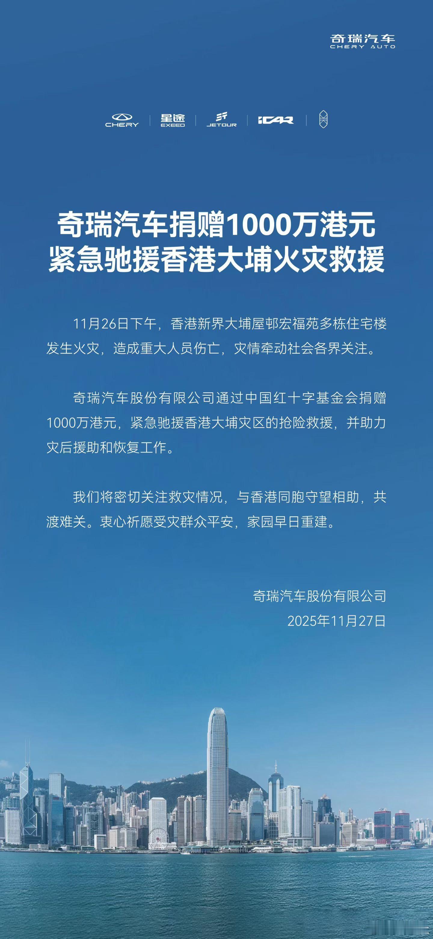 车评观察 捐赠1000万港元,紧急驰援香港大埔火灾救援