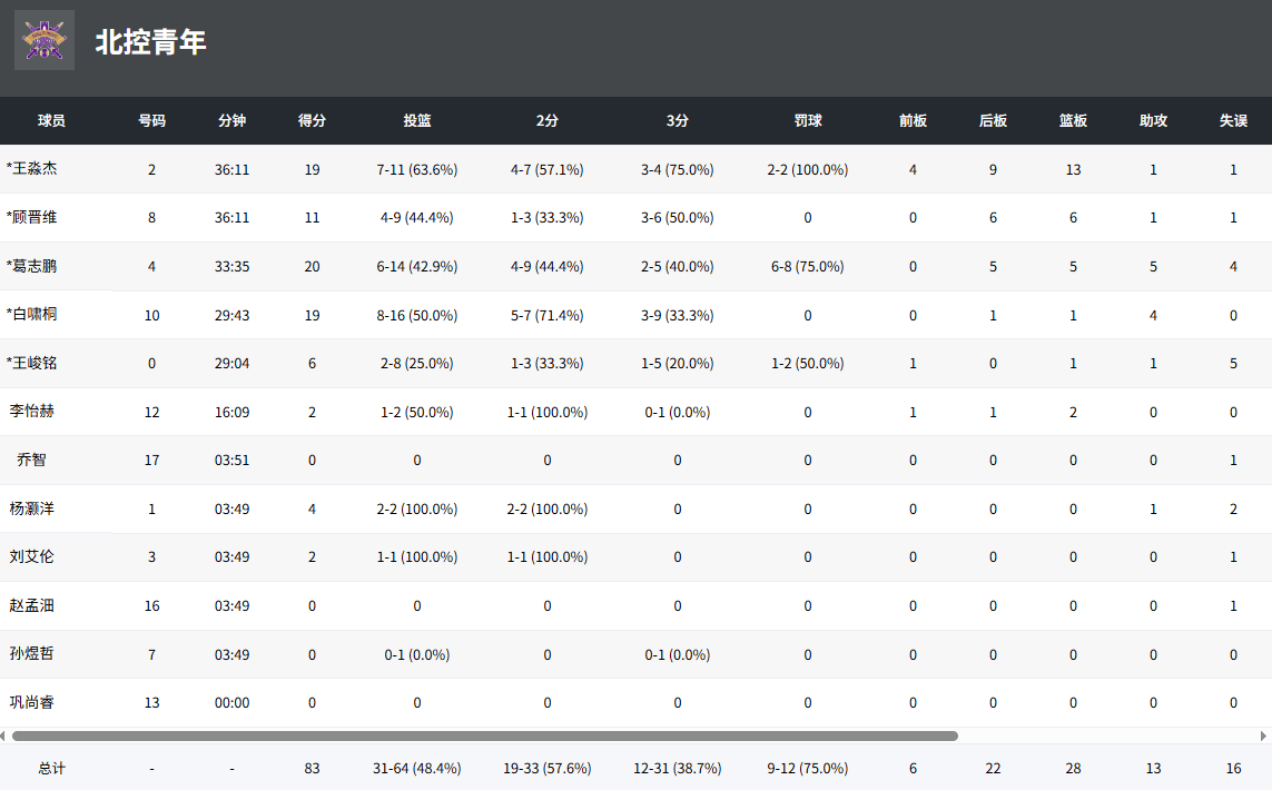 北控:葛志鹏20分、王淼杰19分、白啸桐19分
