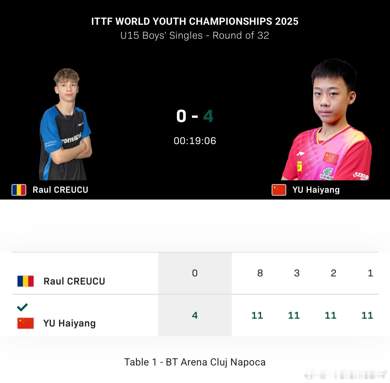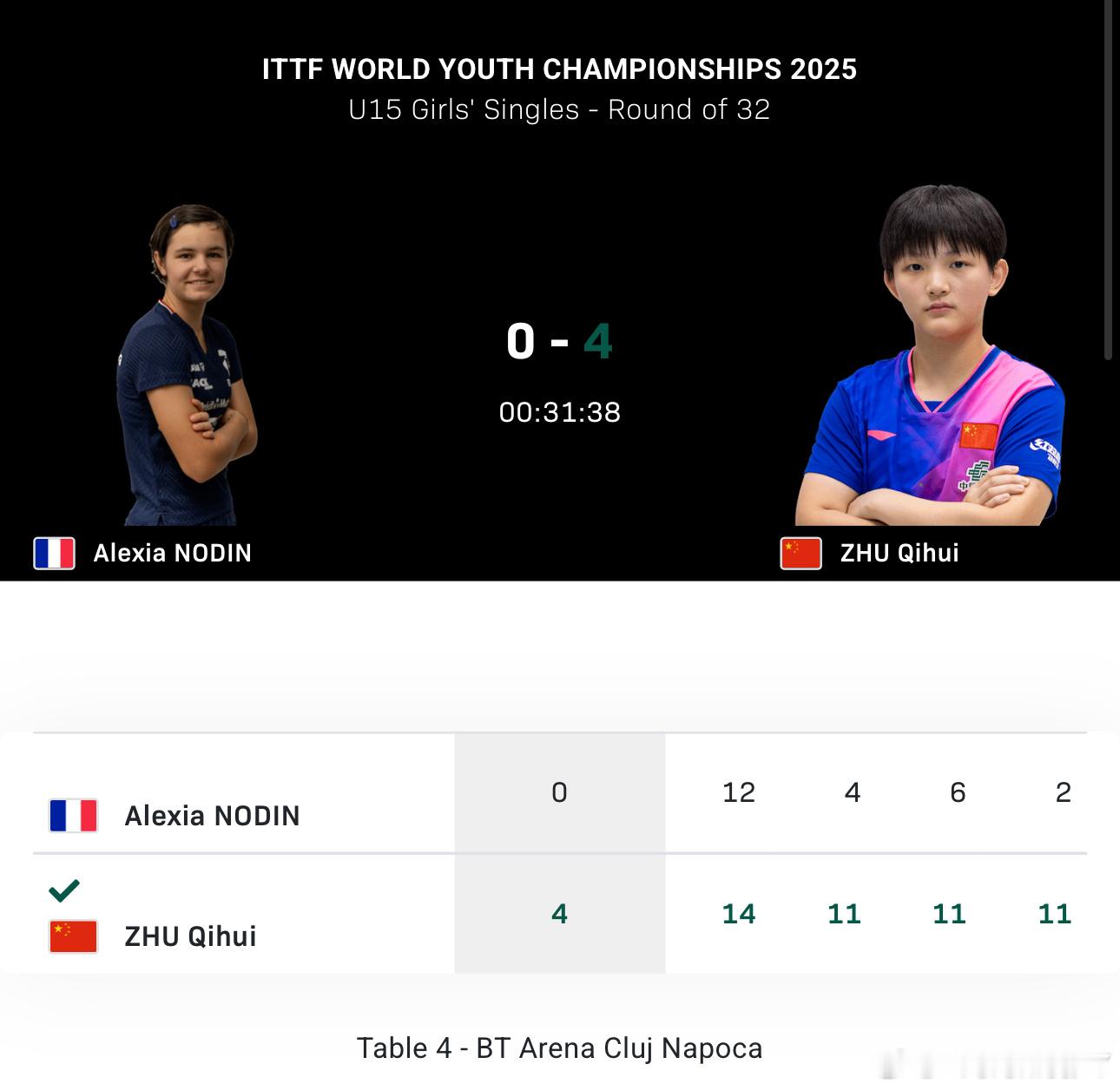 2025世青赛U15男女子单打32-16祝启慧4-0诺丁于海洋4-0劳尔16-8祝启慧VS阮芯诺于海洋VS夏克巴