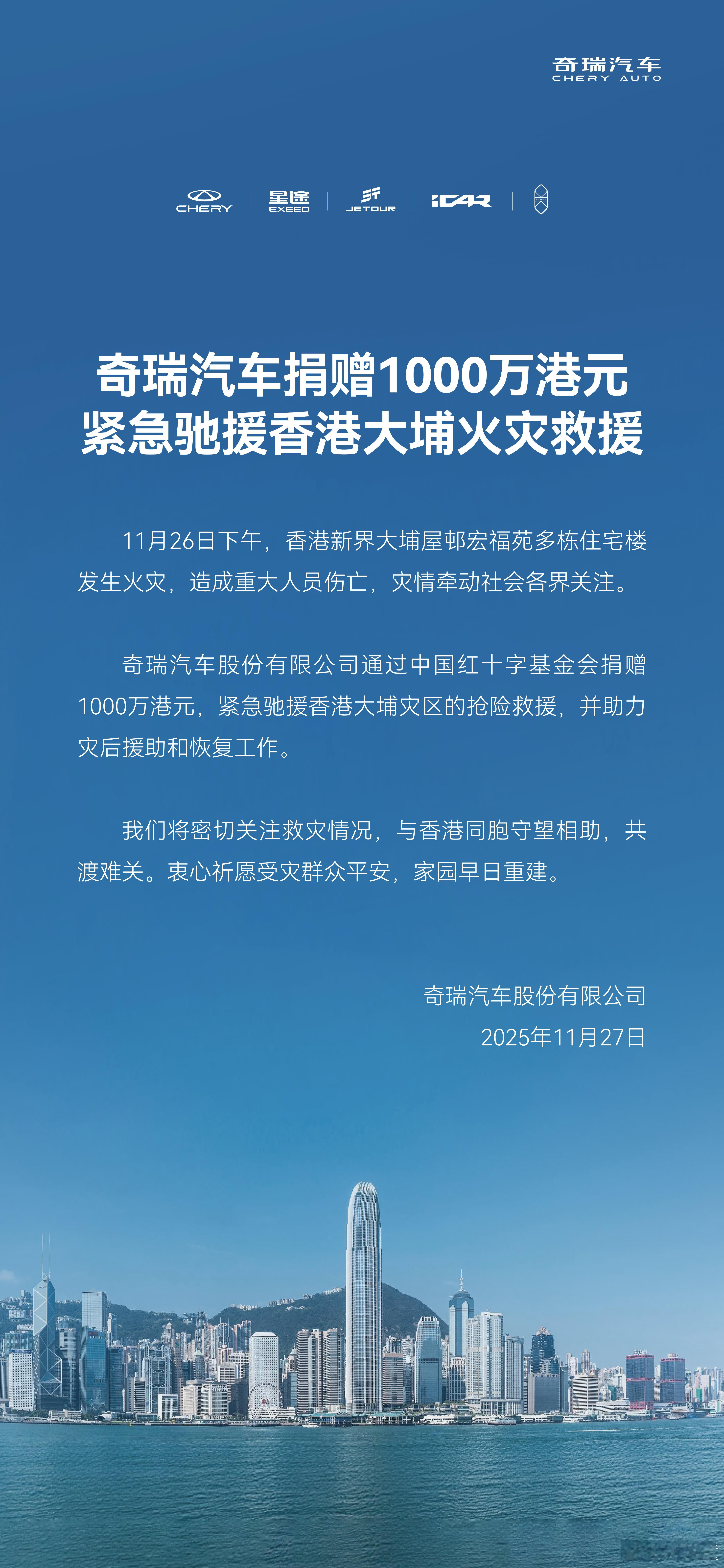 多家车企为香港火灾捐款 奇瑞汽车捐赠1000万港元紧急驰援香港大埔火灾救援,愿大