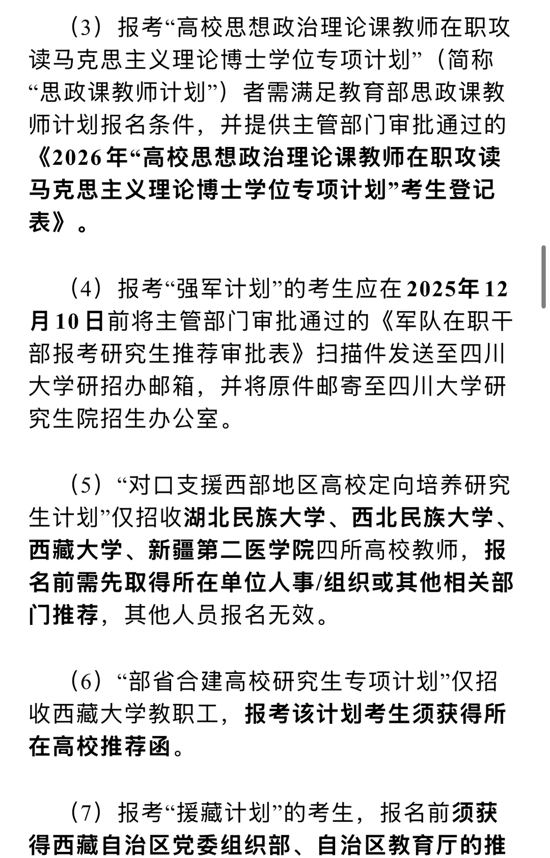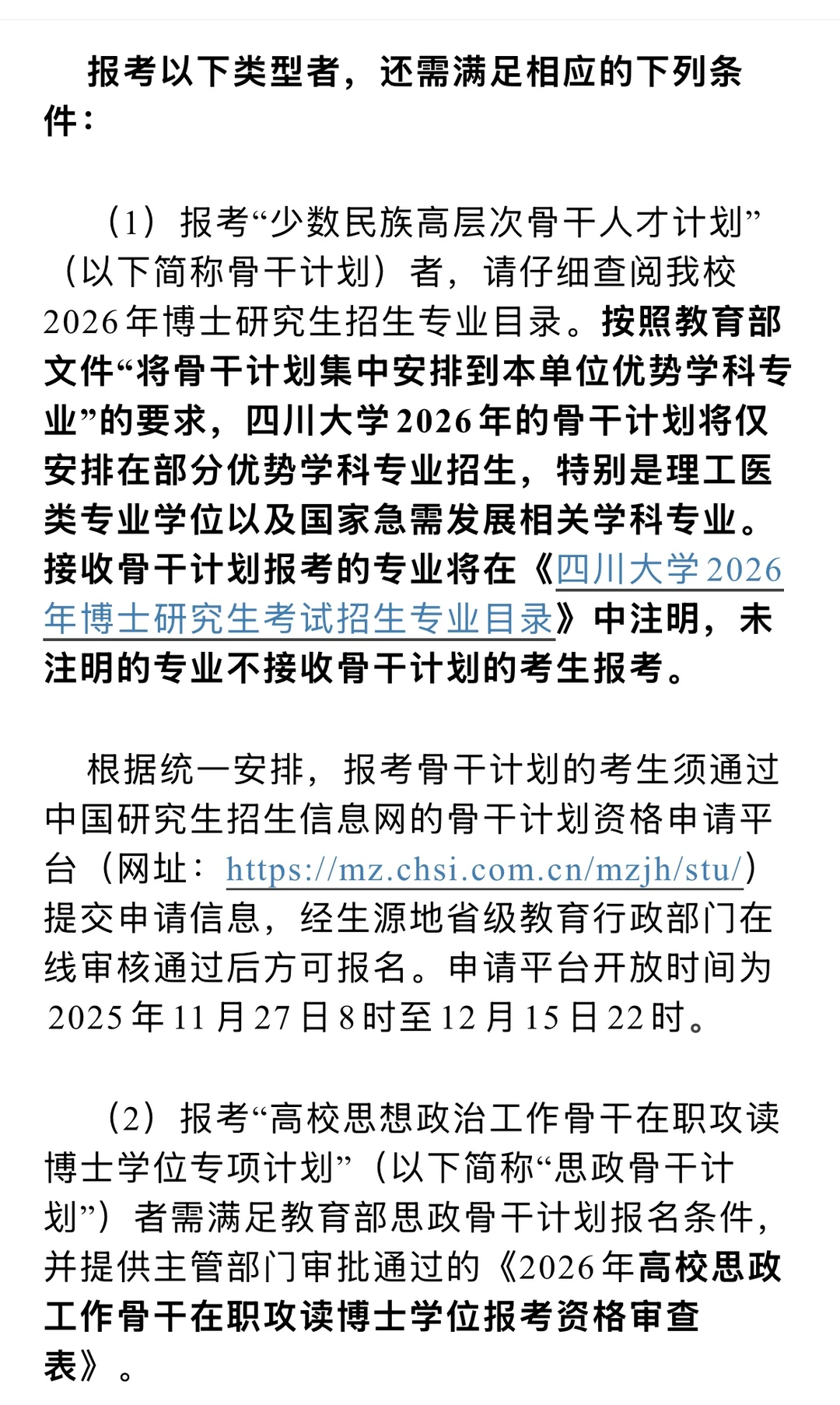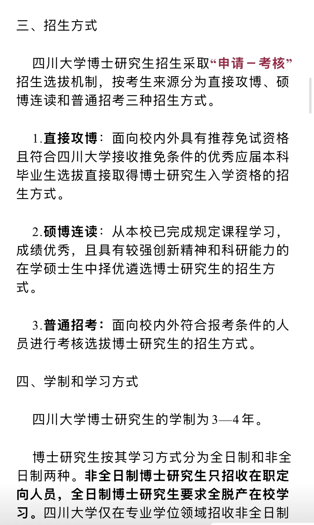 博士研究生招生计划按就业方式分为定向就业和非定向就业两种类别。除国家专项计划和专业学位博士外,四川大学原则上不招收定向生。确需招收定向生的博士招生院系所,其招收人数须控制在年招生规模的5%以内。定向生录取前须与学校、用人单位分别签订定向就业合同。非定向生的人事档案必须转入我校。考生报考时的报考类别即为录取类别,请考生在报考时慎重选择。