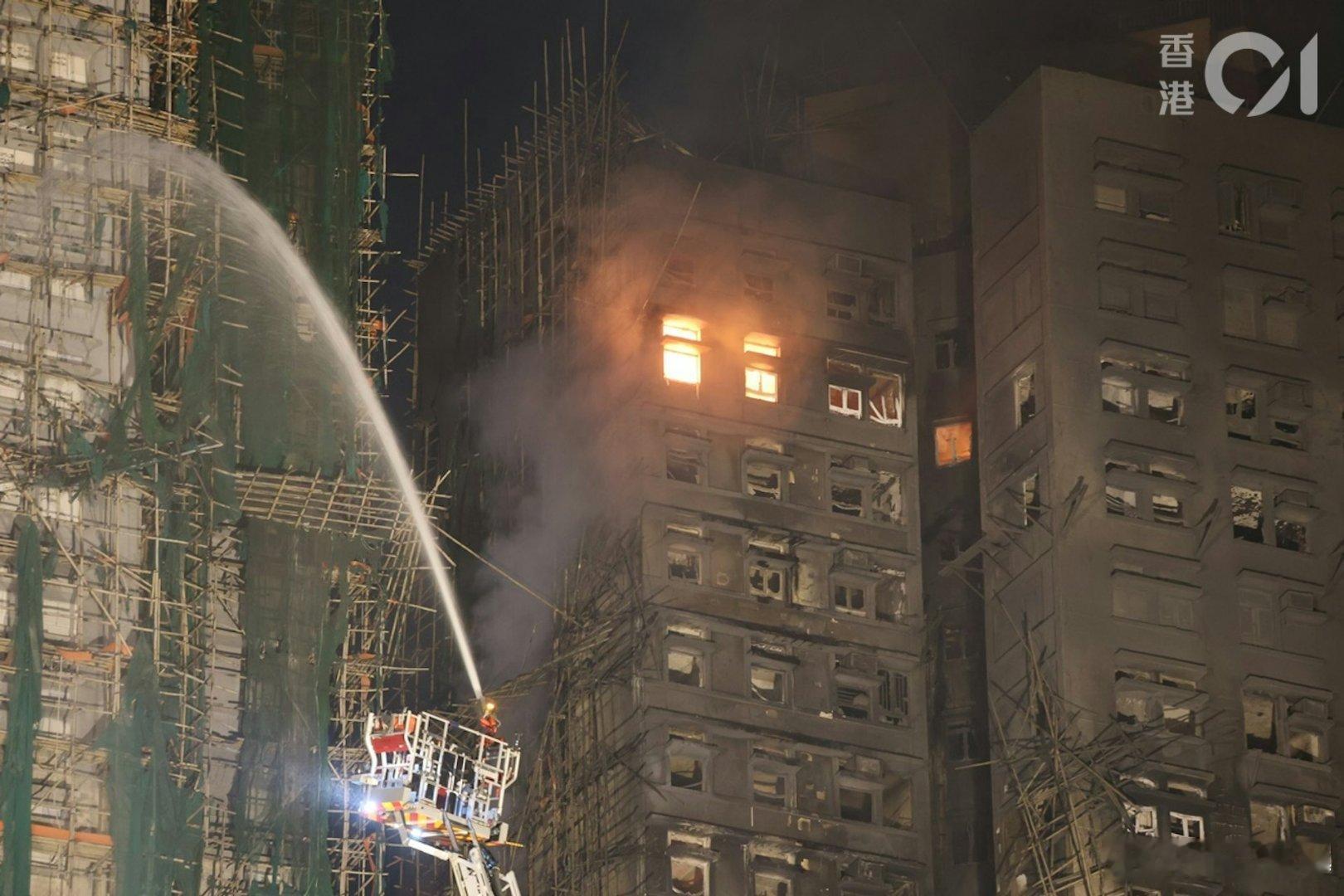 香港火灾救援最新消息 港媒报道称,截止今晚21时,现场(靠近顶楼位置)仍有窗口可见明火。消防员正在继续连夜向上进攻及搜救。