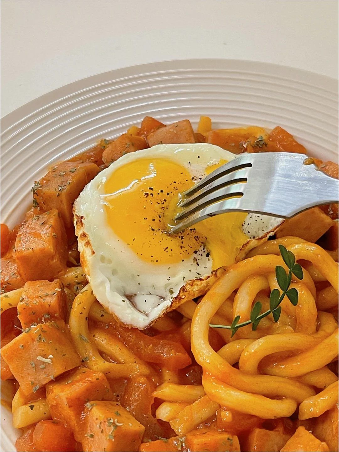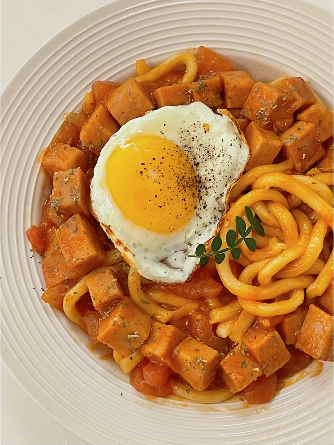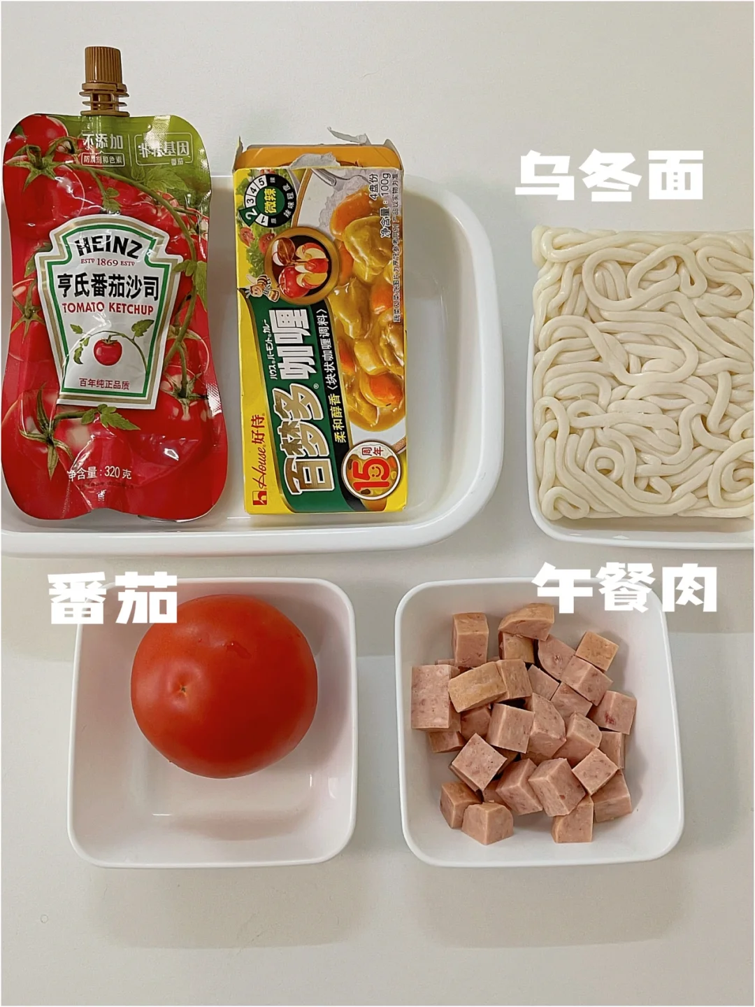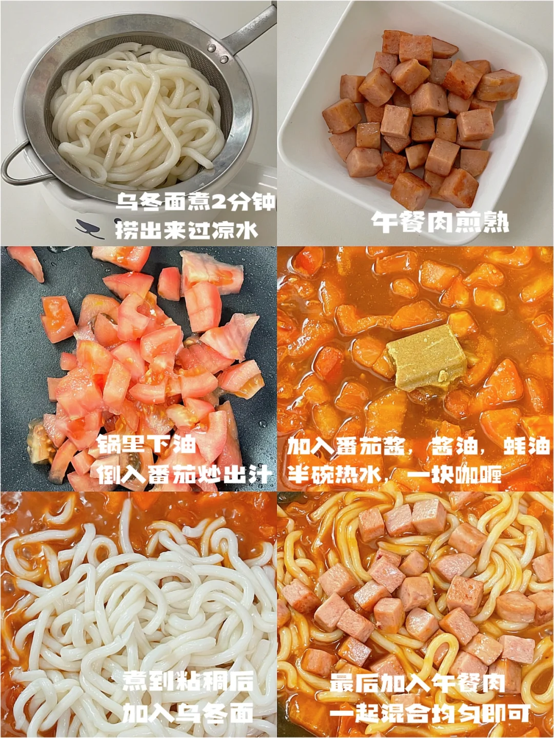 乌冬面这么做我真的可以[哭惹R] 任何一个人没去试一试我都会伤心的💔 原来番茄搭配咖喱这么绝[赞R] 原材料在图三🔍 -午餐肉切粒|番茄|乌冬面|番茄酱|咖喱 详细做法在图四🔍 1️⃣乌冬面煮熟捞出过冷水沥干备用 2️⃣午餐肉切粒,然后倒入锅中煎熟 3️⃣锅里放一点油,番茄切碎炒出汁倒一碗热水 4️⃣煮沸后+一块咖喱,1勺酱油,1勺蚝油 5️⃣倒入乌冬面和午餐肉粒混合均匀煮浓稠即可装盘 真的是超简单的做法,尝口酱汁好吃到原地转圈圈 大家快来get这份美味👍