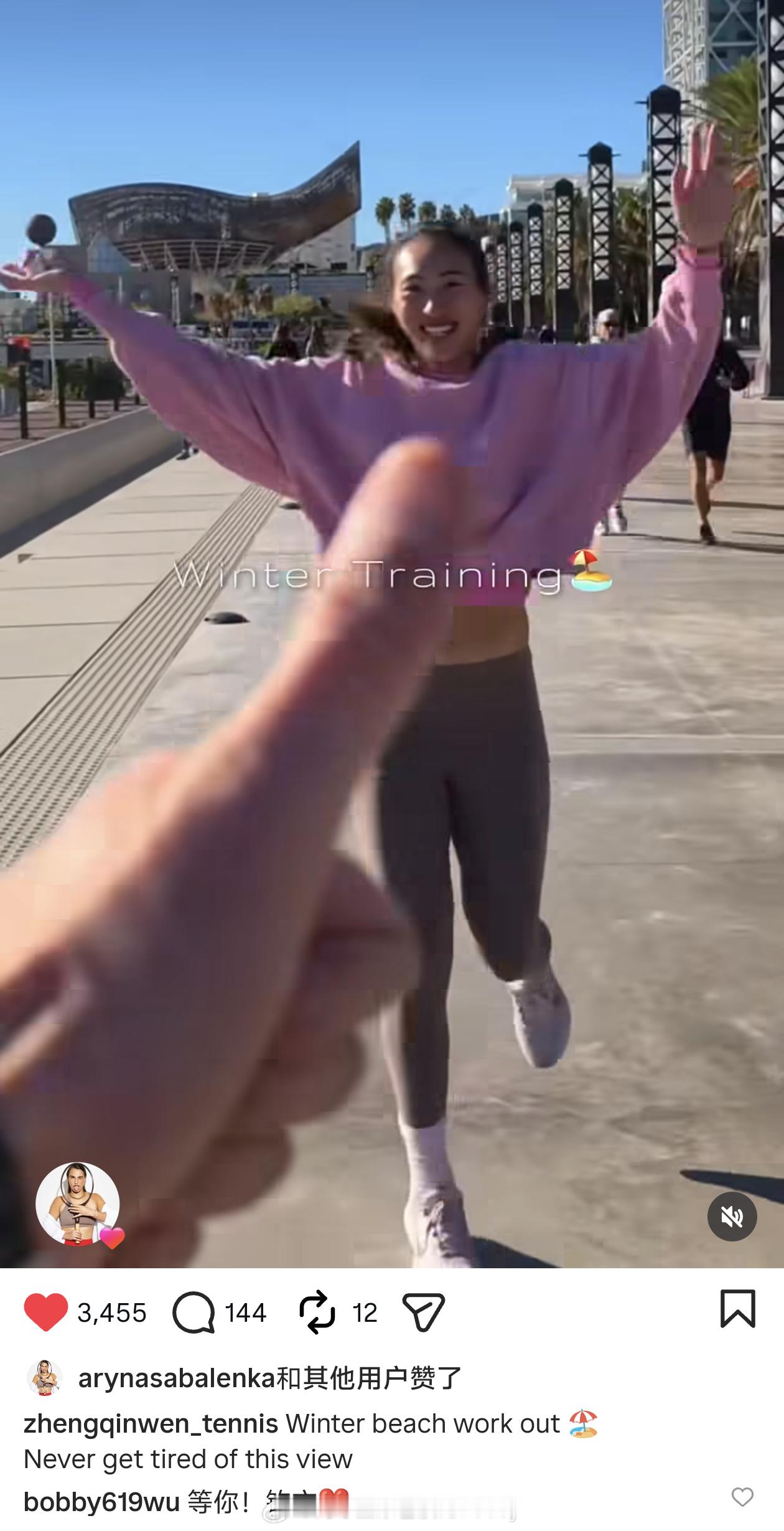 郑钦文晒冬训视频 萨巴伦卡点赞郑钦文ins,最近她们两个互动频繁🔥网球talk