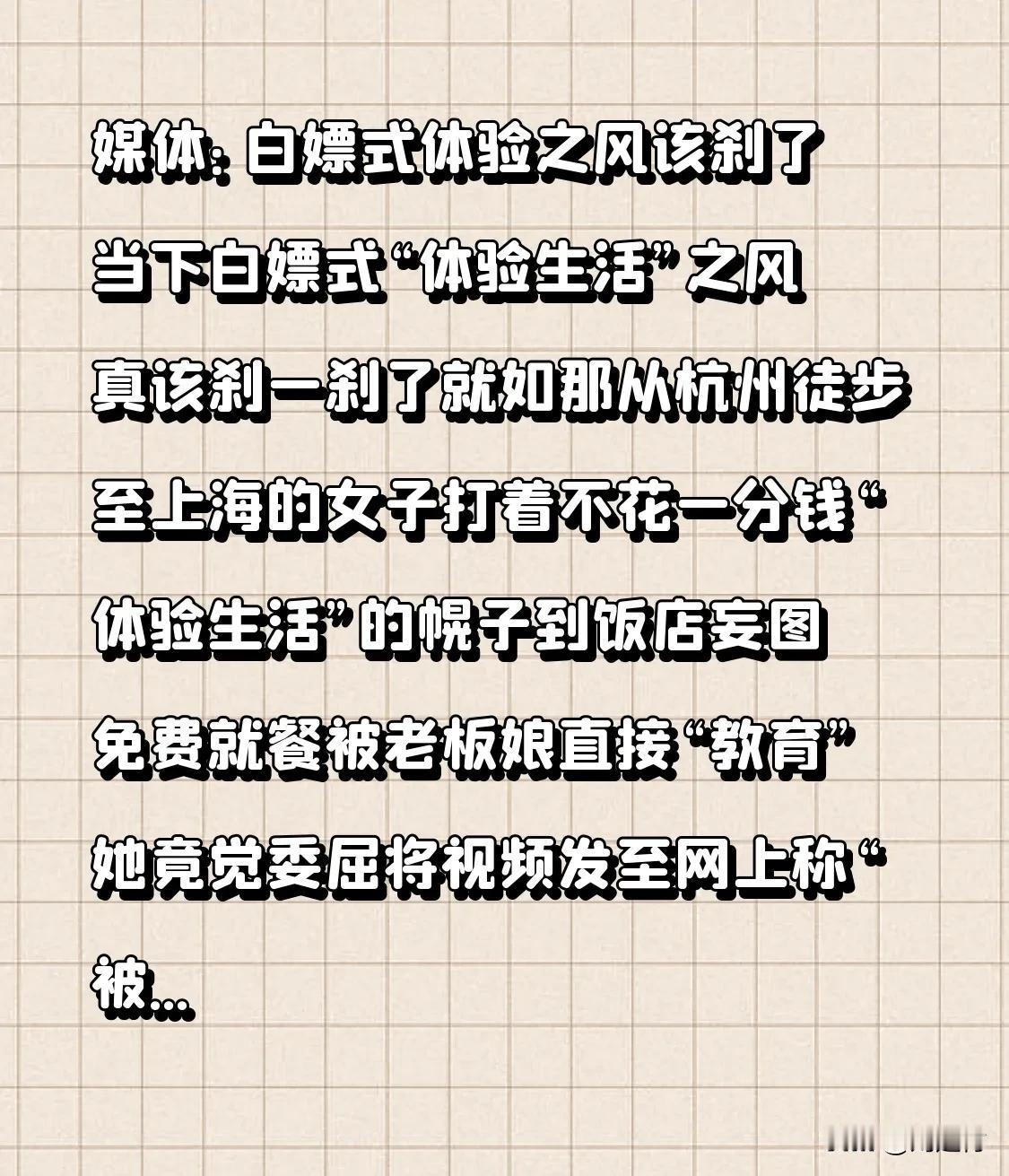 媒体:白嫖式体验之风该刹了 媒体:白嫖式体验之风该刹了 当下 白嫖式“体验生活”之风 真该刹一刹 就像那从杭州徒步到上海的女子 打着不花一分钱“体验生活”的幌子 去饭店想免费吃饭 被老板娘直接“教育” 她却觉得委屈 把视频发网上称“被拒绝令人心寒” 结果网友一边倒地支持老板娘 这般行为 是把白嫖当成体验 哪有不劳而获的体验? 真正体验生活 要靠自身劳动 如今很多打着“体验生活”旗号的视频 本是让大家了解不同群体状态 但这种白嫖式体验 纯属道德绑架 还想借此博流量 实在不可取 白嫖 网络白嫖族 上海白嫖事件 白嫖女子