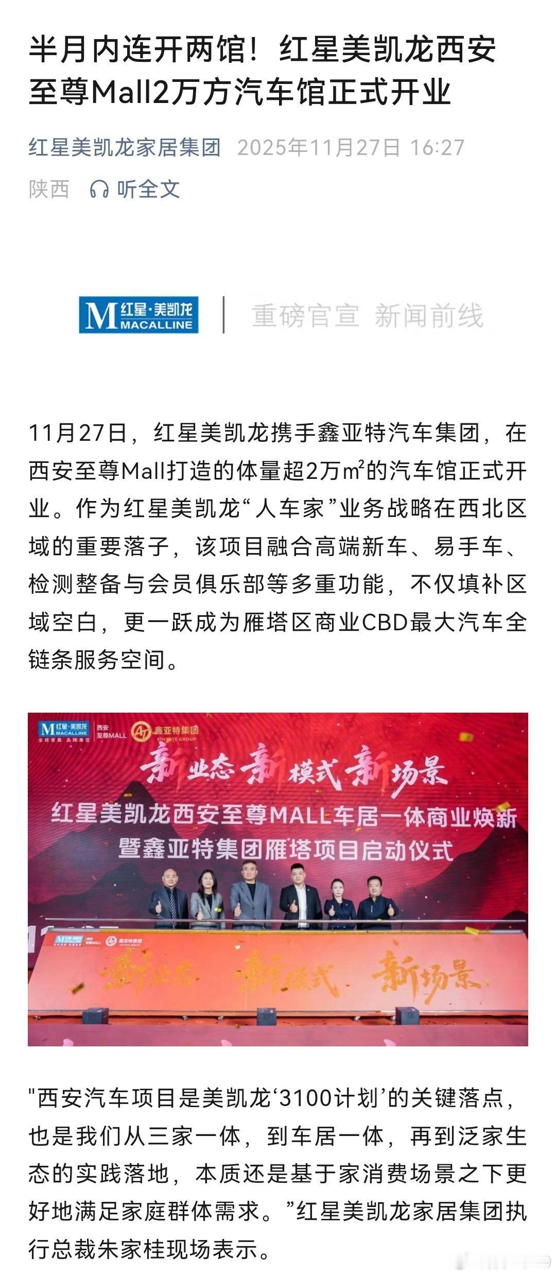 红星美凯龙联合鑫亚特汽车集团搞的汽车馆开业了房地产退潮后留下的很多资源开始被拿来搞车了,很多家居建材市场在核心地段,车商还是会考虑入驻。所以年初国美就官宣了国美车市,现在红星美凯龙也加入搞汽车馆了。 新能源汽车