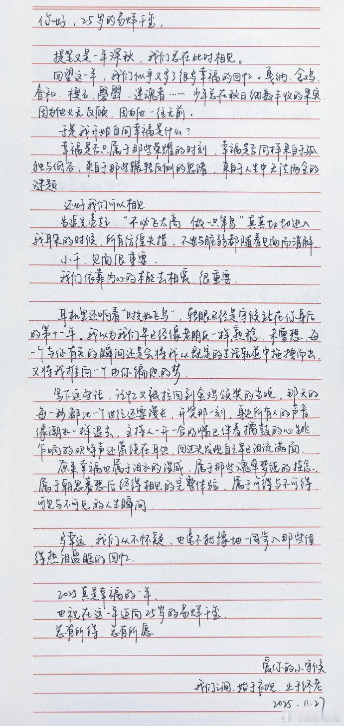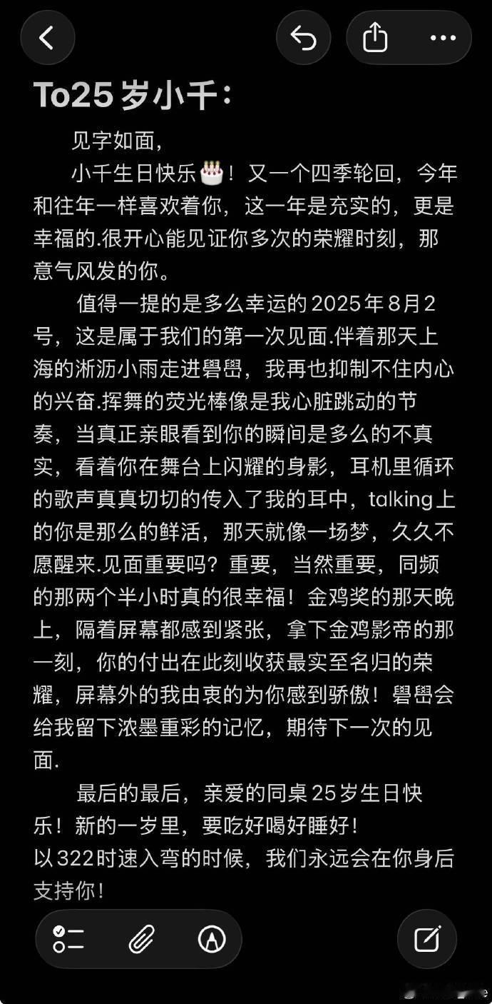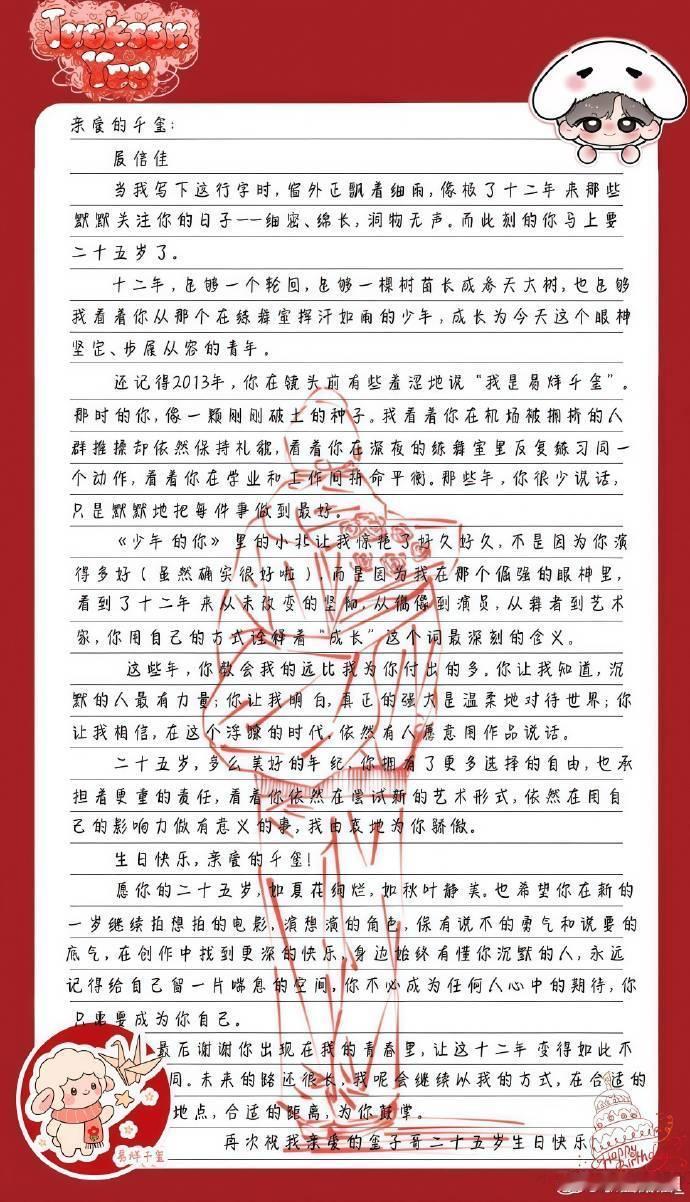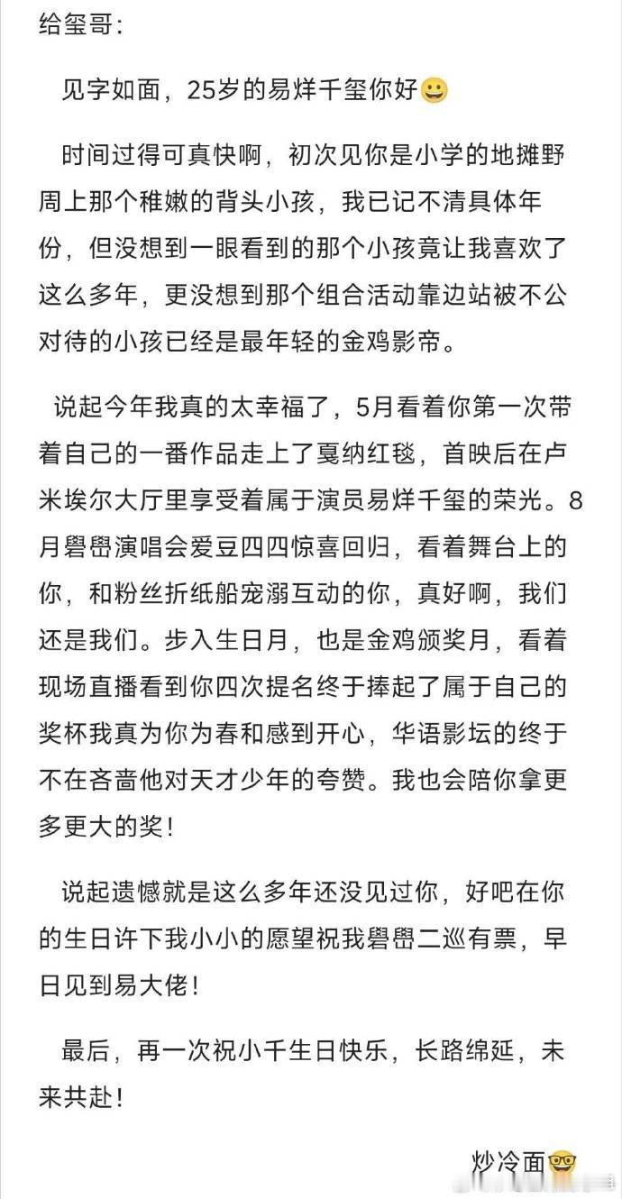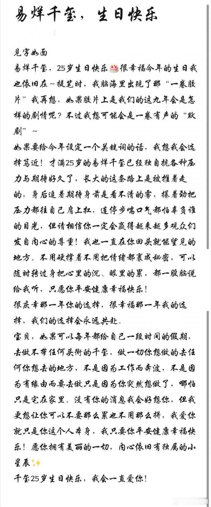 粉丝写给易烊千玺的生日信被粉丝给易烊千玺写的生日信整破防了好真诚好用心的千纸鹤祝最年轻的金鸡影帝易烊千玺生日快乐🎂希望你在丰富多样的角色中不断拓展演技的边界,期待未来继续在银幕上为观众带来更多惊喜与精彩
