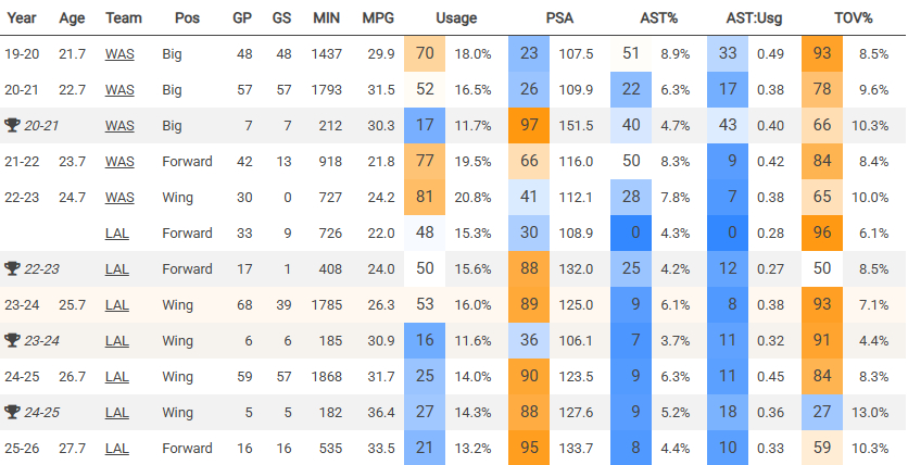开始看火勇之前提一嘴八村。昨天打快船的比赛八村防守很扎眼,这没错。我其实说过很多次八村了——就在季前赛总结,我还提了一嘴他是个完成度高,但技能组没什么吸引力的球员。这个“没什么吸引力”怎么体现?其中主要的部分就是防守端:你把八村视作侧翼他跟不上外线,你把他视作内线他护不了框。八村在防守端肯定是难用的。他本质上是一个需要被藏起来的球员。但湖人把他和卢卡、里夫斯、勒布朗放在一起。这等于放大了他的“难用”,肯定会导致他的观感变差。但我还是需要提醒大家。当大家看到一个球员的缺点时,也不能忘记他的优点。八村的优点是什么?他的优点是他是联盟最近三年得分产效最高的角色球员之一——没错,我用了“最”字。很多人看到场均17次出手21分的狄龙觉得厉害。但大家究竟清不清楚八村现在是什么得分效率?八村目前本赛季的得分效率是场均10.1次出手,得14.9分。看起来平平无奇?但实际上,联盟能够做到场均出手小于等于10.1次,得分高于八村的只有两个人:多孙穆(16.4分)、艾顿(15.5分)。大家看图1,PSA这一项。我们看一下八村加盟湖人之后的得分效率——带小奖杯图标的是季后赛。带背景色的数字是超过联盟同位置百分比。是的,如大家所见,八村垒是一个连续多年得分效率超过联盟90-95%同位置球员的家伙。而且,他并不是“低产高效”,而是在自己定位下标准的“高产高效”——他的定位,只能算是球队第四或者第五出手选择。而在这个定位下,他不仅得分产量是前5%,得分效率也是前5%。(2024-25赛季如此,2023-24赛季也是如此,他的产效一直是自己出手数区间的前四名)这个搜索条件并不难搜。大家去搜一下就能看到,和八村同样出手产效的,基本都是内线球员——艾顿、阿伦、戈贝尔、杜伦、奥孔古、戈登……而八村水灵灵的以一个外线的身份每年稳定的跻身这些人之间——连续三年。甚至季后赛三年里也只“拉了”一年。这就是他的价值所在。我们不能只看到他上场丢分了。看不到他9次出手就拿了13分(打快船)。高效把握球星分出来的定点机会;半节不摸球,一接球就必须投进——这些并不是很容易做到的事情。但八村是联盟最擅长做这些的球员之一。许多人都在说八村应该下替补——但我觉得这件事其实形式大于实际——无论八村在首发还是替补,不都还是要上斯玛特的吗?归根结底这是个斯玛特多用还是少用的问题。八村如果在首发更觉得舒适。而且斯玛特也愿意接受替补和任何安排。那首发先这样没什么不好——斯玛特之前场均30分钟的上场时间肯定多了,老将就算好用也要省着用。八村上场就是打对攻。斯玛特上场就是上强度。这本来就是湖人的比赛设计——斯玛特对于上强度重要;八村对于对攻同样重要。让可能涉及续约/交易的球员先把常规赛数据拿到手,这样后续怎么处理也都方便(交易/季后赛下替补)——排兵布阵并不只是篮球问题,也是人情生意。而至于交易。我还是一直以来的看法:“你不能因为一名球员你没那么需要了,就想用他去换一盒饼干。”八村是个好球员。如果湖人真要交易他,需要将他作为“好球员”卖出去,而不是作为“我不需要”了的球员扫地出门——所以,现在的筹码博弈是明智的、也是必要的。快船因为谈好了比尔就贱卖鲍威尔的错误,湖人可不能不引以为戒。洛杉矶湖人