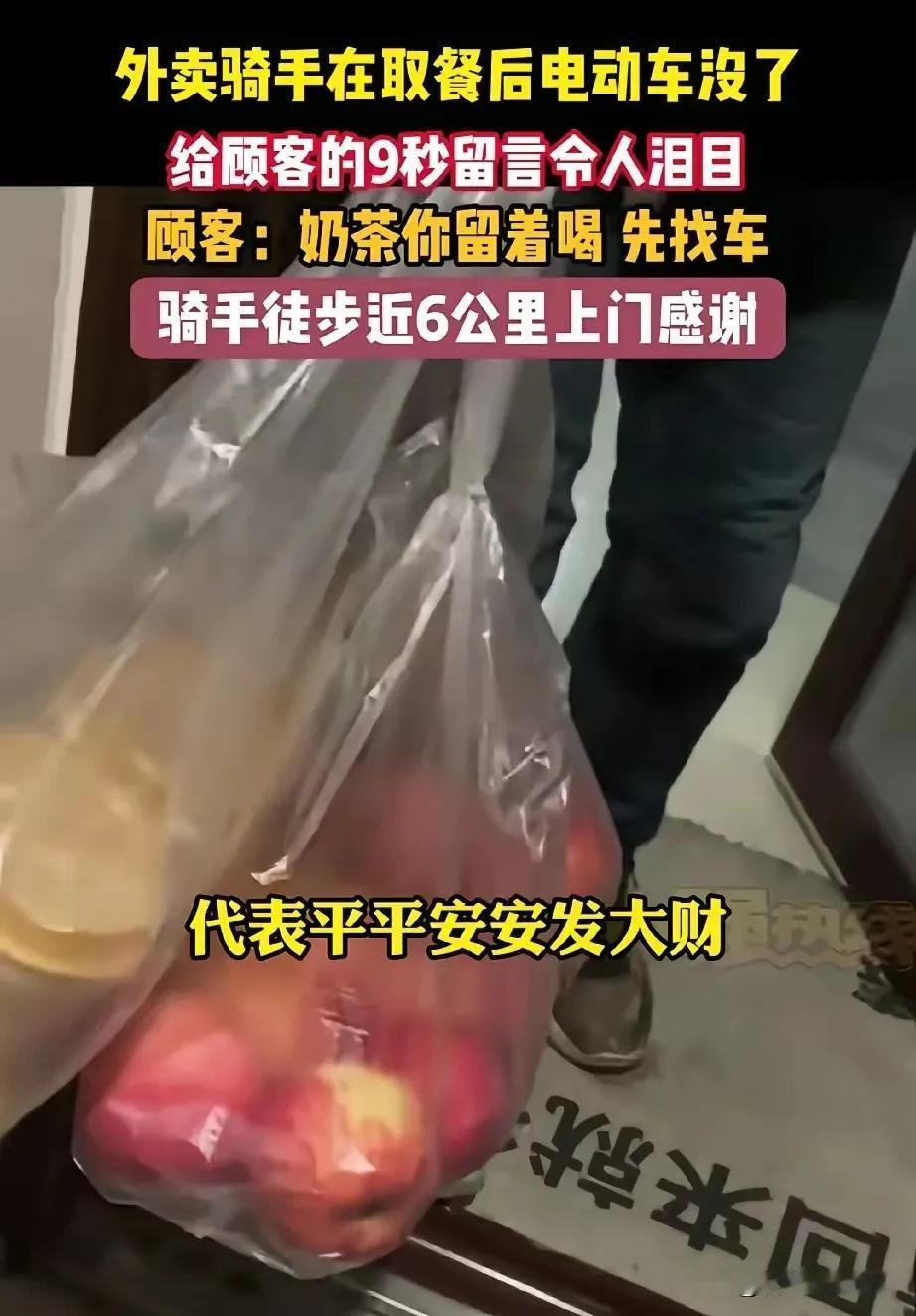 火到人民日报了!湖北武汉,一位外卖小哥声音颤抖,带着哽咽给客户发了一段语音:“我取餐时电动车丢了,您订的奶茶没法及时送到,我得去找车,这杯奶茶多少钱,我赔给您。” 电动车是外卖小哥的半条命——那天取完餐一转身,车没了,他攥着奶茶的手都凉了。 这不是普通的代步工具,是他今天跑单的依仗,是赚房租、赚饭钱的家伙事儿,丢了车,不光这单送不了,后面排的几单也得黄,搞不好还要赔超时费,攒了好久的好评说不定也得砸在这事儿上。 所以那通语音里的颤抖和哽咽,不是演的,是真的慌了——一边是要负责的订单,一边是没了着落的生计,他只能先想着把客户的损失赔上,哪怕自己今天可能白干。 跑外卖的人都知道,车就是饭碗的延伸,丢了车,等于半天甚至一天的活都没了根基,那种慌是从脚底板往上冒的,不是几句“没事”就能压下去的。 客户接到语音的时候,应该也听出了那股慌里的无助。没跟他算“送餐超时怎么办”,也没问“怎么连车都看不住”,就回了一句“奶茶你留着喝,先找车”。 这话没多华丽,甚至有点随口,但砸在小哥耳朵里,可能比那天的冷风还暖——在他已经做好被指责、被索赔的准备时,有人先顾着他的难,没揪着他的错。 客户未必想过这一句话能有多大分量,可能只是觉得,一杯奶茶而已,比起小哥丢车的糟心,实在算不得什么。可对正陷在窘迫里的小哥来说,这不是“一杯奶茶的事儿”,是有人没把他当成“送外卖的机器”,是有人看见他的难处了。 小哥没把这话当客套。找车的间隙,他绕了好远的路去水果摊,挑了一袋红透的苹果——不是多贵的礼,是他跑单时总听客人说“苹果代表平平安安”,也是他能想到最实在的祝福。挑的时候他还特意把带疤的都挑出去,攥着袋子在衣角上蹭了蹭,确定每个都干净才付了钱。 之后他没等找到车,就攥着那袋苹果往客户家走,近6公里的路,没有车代步,只能一步步挪,可能走得脚腕都发疼,裤腿上还沾着找车时蹭到的墙灰,但手里的苹果一直没松。他没想过要什么回报,就是觉得,人家肯在自己最难的时候让一步,自己总得把这份好递回去。 等他敲开客户家门的时候,手里的奶茶可能已经凉了,可苹果是温的——是他揣在怀里走了一路的温度。 客户开门看见他气喘吁吁的样子,还有那袋洗得发亮的苹果,应该也愣了一下。没人规定客户必须体谅外卖员,也没人要求外卖员要为一句善意徒步几公里,但他们都没按“规矩”来,选了往对方的方向多走一步。 这事儿能火到人民日报,不是因为多惊天动地,是因为它戳中了太多普通人的日常。我们每天都在跟陌生人打交道,大多时候是“完成交易”就转身,很少会停下来看看对方是不是正难着。 外卖员怕超时被差评,客户怕餐品凉了不好吃,大家都裹在自己的生活里往前赶,可偶尔有这么一次,有人肯多花半分钟听一听对方话里的慌,有人肯多走几公里还一还这份暖,就成了日子里的软和。 这不是什么“伟大的善意”,是两个陌生人在各自的生活里,给对方递了个台阶。客户没站在“消费者”的位置上苛责,小哥没落在“服务者”的身份里敷衍,他们只是把对方当成了跟自己一样,会慌、会难、会记着别人好的普通人。 这种软和,比任何宏大的叙事都更戳人——它让我们知道,哪怕日子再奔波,也总有人能接住你的情绪,总有人会记着你的善意。 各位读者你们怎么看?欢迎在评论区讨论。