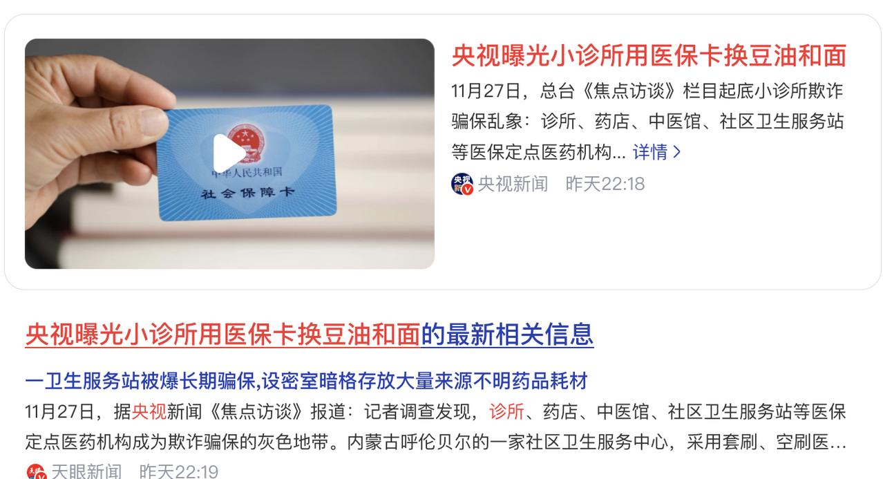 小诊所用医保卡换豆油和面,这不算是什么新鲜的或者秘秘的事情吧。只要是一个去过药店刷过医保的人,都见过这种情况吧,称不上曝光,只能算是人尽皆知的事情,上了一次新闻而已。 医保用的时候,限制太多,诸多不便。但是可以使用医保的定点机构,比方说药店等,可操作性太强,各种低档的便宜的货高价套取医保余额,可以说是医保的蛀虫。 希望解决医保的使用便利问题,打击医保购药低质价贵现象。