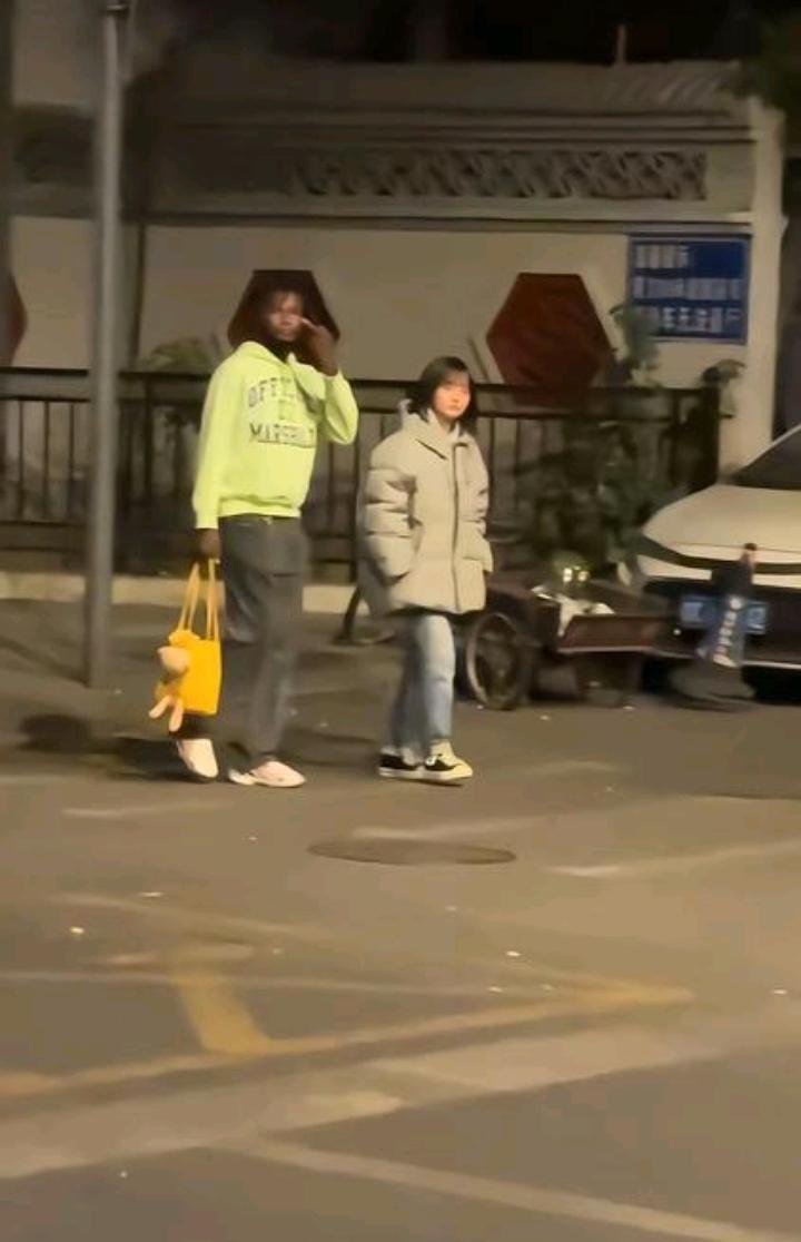 一非洲人和一个女子偎依着在街上走着。 看非洲人的表情,很幸福很自豪很满足的样子。 本来这都不算什么。只是这非洲人一边走一边还不忘向旁人竖着中指,似乎在向旁人挑衅,十分看不起的样子。 好像在说,你花几十万追不到的小仙女,我两句话就让她乖乖倒贴就范。 大爷长得黑,却是她心中的白马王子。你们不服还不行。