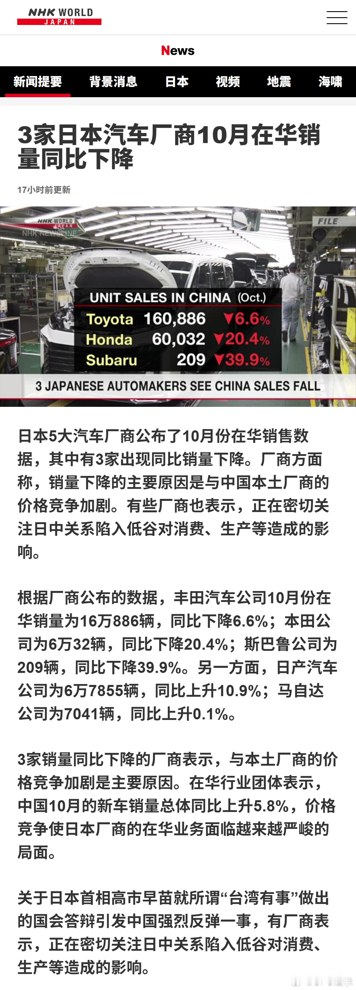 日媒:3家日本汽车厂商10月在华销量同比下降
