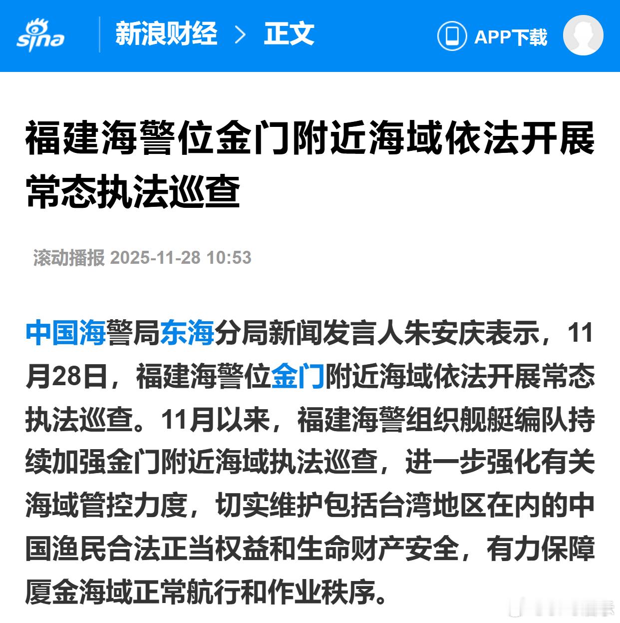 福建海警位金门附近海域依法开展常态执法巡查