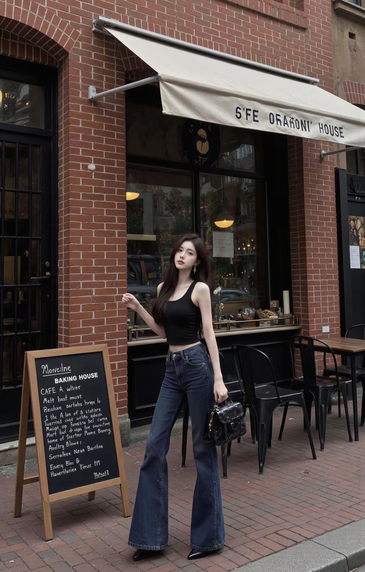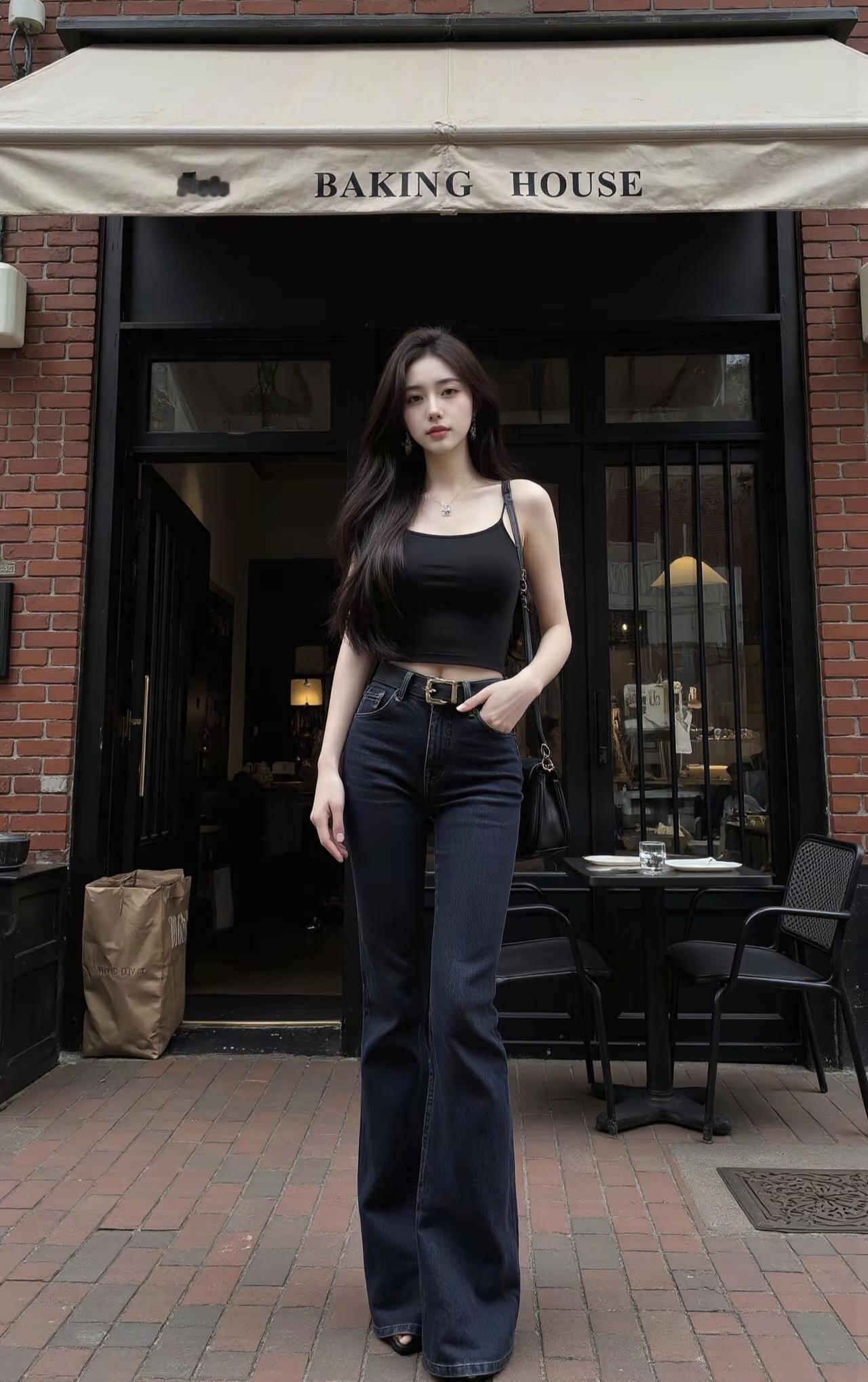 红砖墙衬着烘焙屋的暖调,黑吊带裹着松弛的精致。喇叭裤扫过砖缝的风,连路过的香气都慢了半拍——今日份的随性,是藏在腰线里的舒展。