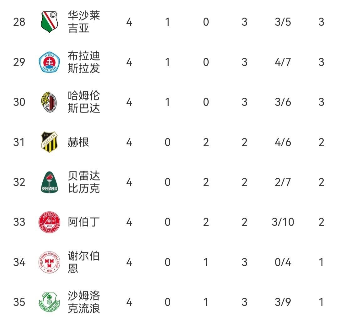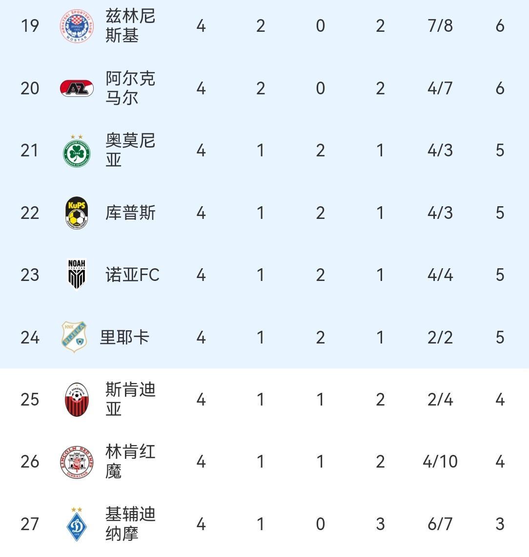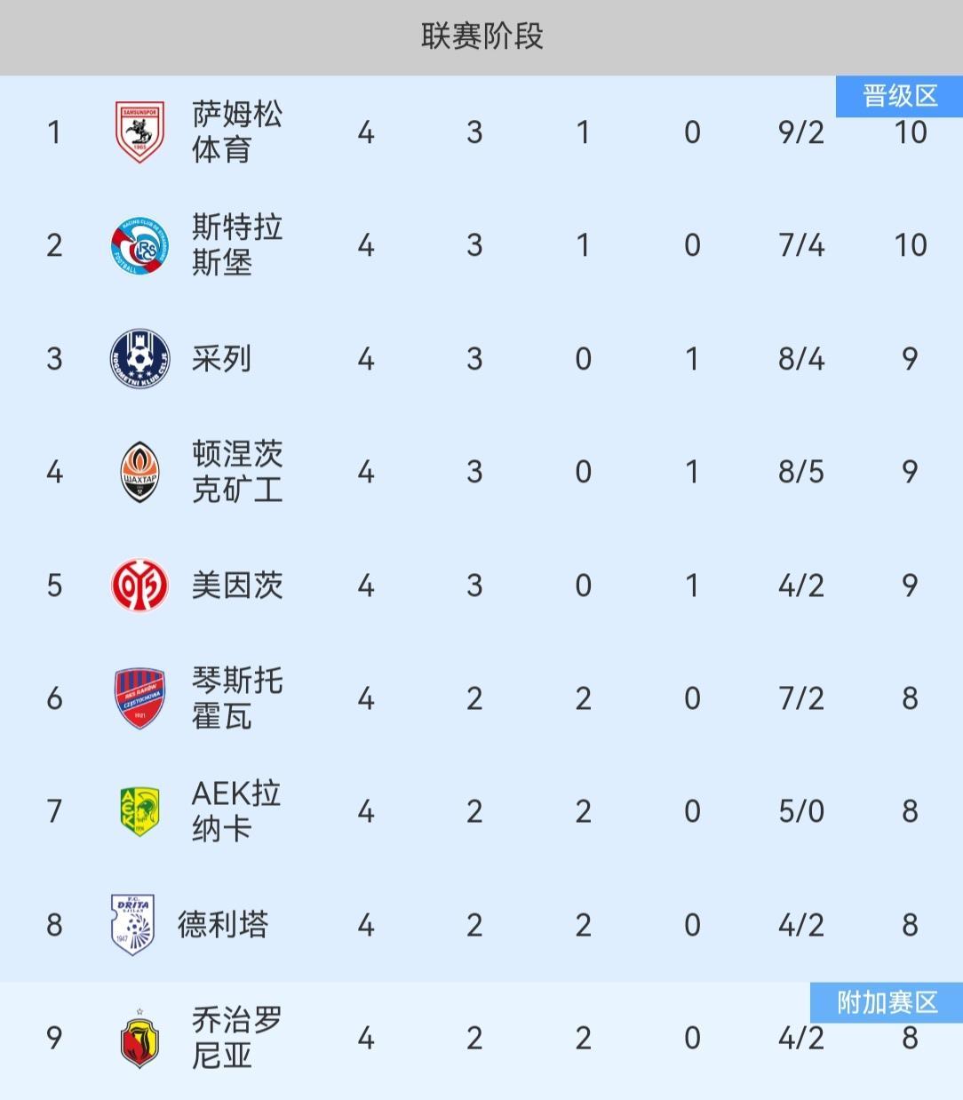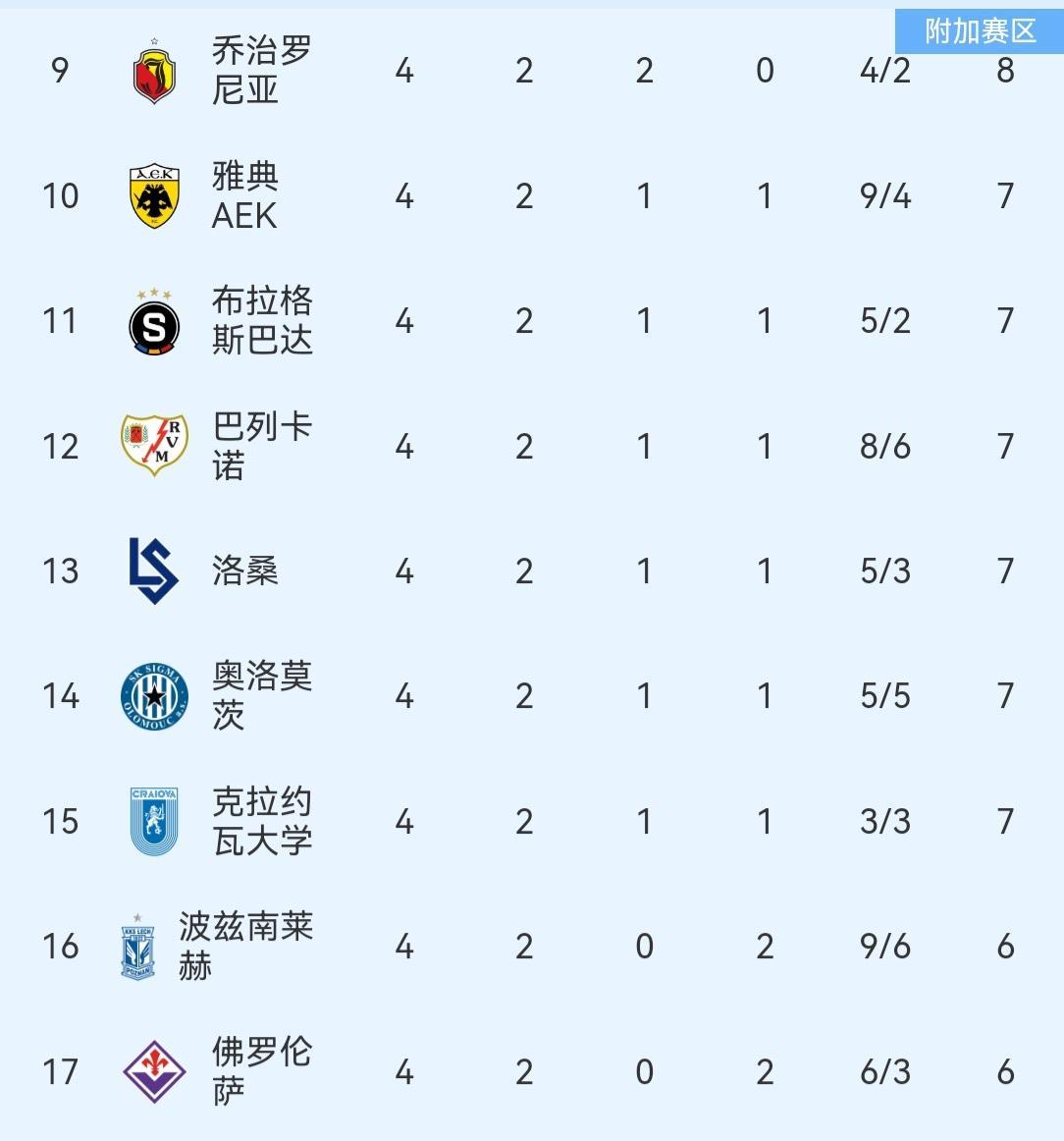 欧协联第四轮综述 随着水晶宫1-2斯特拉斯堡、巴列卡诺1-2布拉迪斯拉发、美因茨0-1克拉约瓦大学、佛罗伦萨0-1雅典AEK,本轮欧协联来自英超、西甲、德甲和意甲的球队全部翻车,来看具体赛果和排名! 斯特拉斯堡主场2-1力克水晶宫和来自土超的萨姆松体育以不败战绩分居前两位,美因茨客场不敌罗马尼亚的克拉约瓦大学遭遇欧协联首败排名第五,采列第三、顿涅茨克矿工第四,琴斯托霍瓦、AEK拉纳卡、德利塔、乔治罗尼亚四队同分位居第五到第九! 雅典AEK战胜佛罗伦萨排名第十,巴列卡诺输球后排在第12,佛罗伦萨第17、水晶宫第18、阿尔克马尔第20,处在附加赛区域的队伍距离直接晋级区差距并不大,一场比赛即可让排名反转,不过还有两轮联赛,再掉队只能去附加赛! 排在积分榜末尾的赫根、贝雷达比历克、阿伯丁、谢尔伯恩、沙姆洛克流浪以及维也纳快速六支球队,至今一胜难求,积分最高的赫根只有两分,距离第八的德利塔有六分差距,直接晋级的希望基本为零,附加赛资格估计也很难拿到!