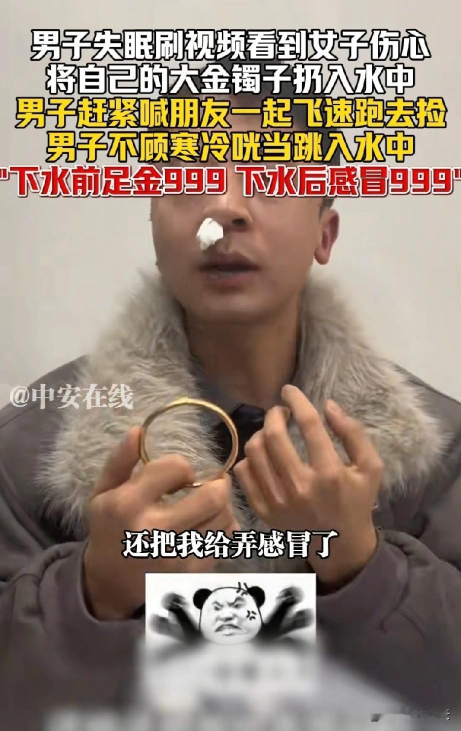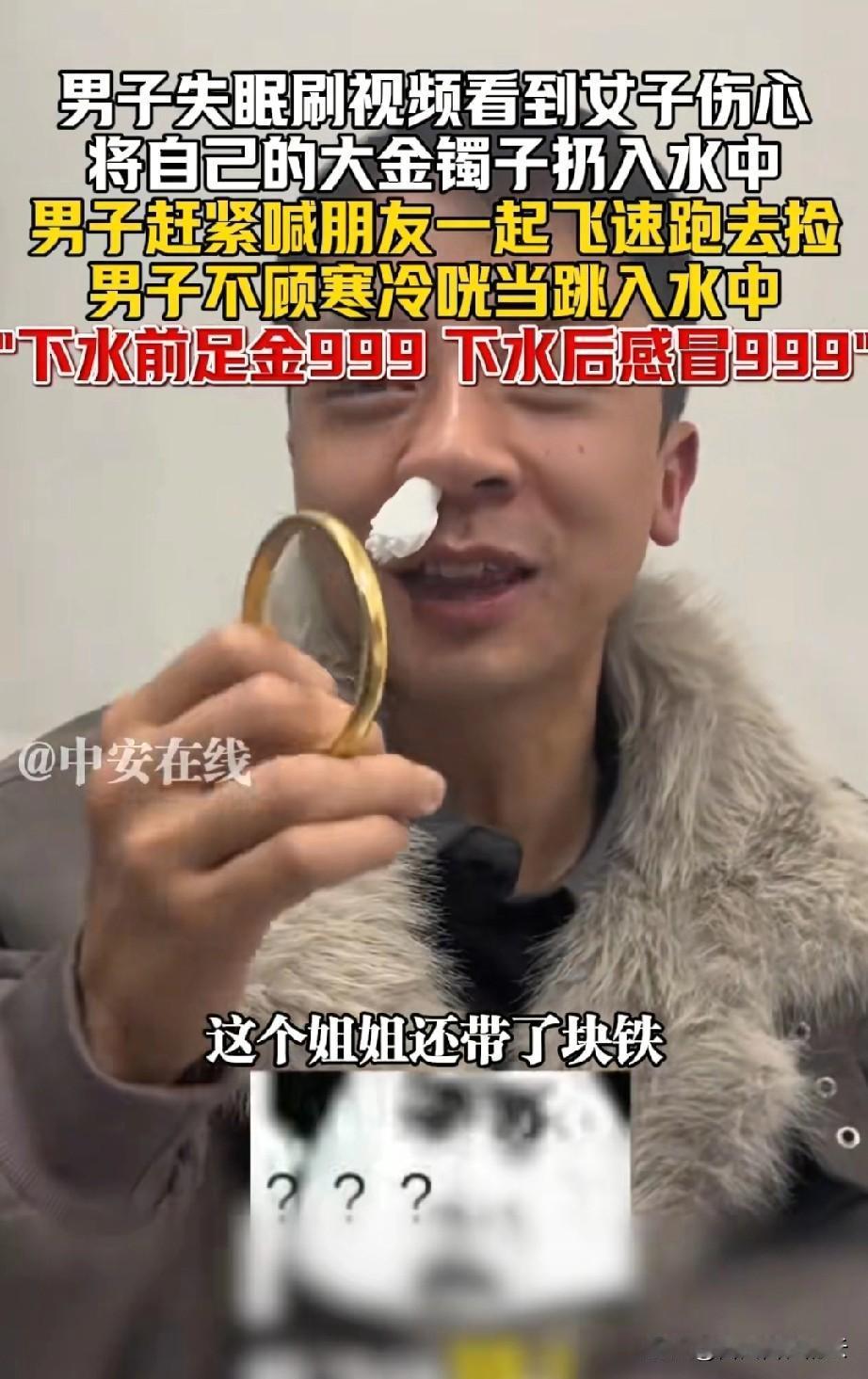 笑死了!小伙刷视频看到一个女子坐在河边把金手镯给扔河里了。小伙反复研究视频,发现女子是真扔下去了,他赶紧叫上一个朋友,两个人开车直奔那条河。 来到女子扔手镯的河边,小伙是二话没说,跳进冰冷的河水里摸手镯,别说,还真让他找到了女子扔的手镯。 可是高兴劲没过几分钟,小伙发现手镯有点不对劲,他拿剪刀剪,剪不动。他以为这铜的,结果还是铁的。 男子觉得又好气又好笑,他说姐你没事戴个大铁块干嘛。还有自己也挺傻的,还以为赚了便宜,结果还把自己还给整感冒了。 有网友说,你也真是够天真的,我可不相信谁会把金子往河里扔。 还有网友说,别让那个女子刷到你,再反咬一口,让你赔她金手镯,你就麻烦大了。 对于这件事,你怎么看呢?
