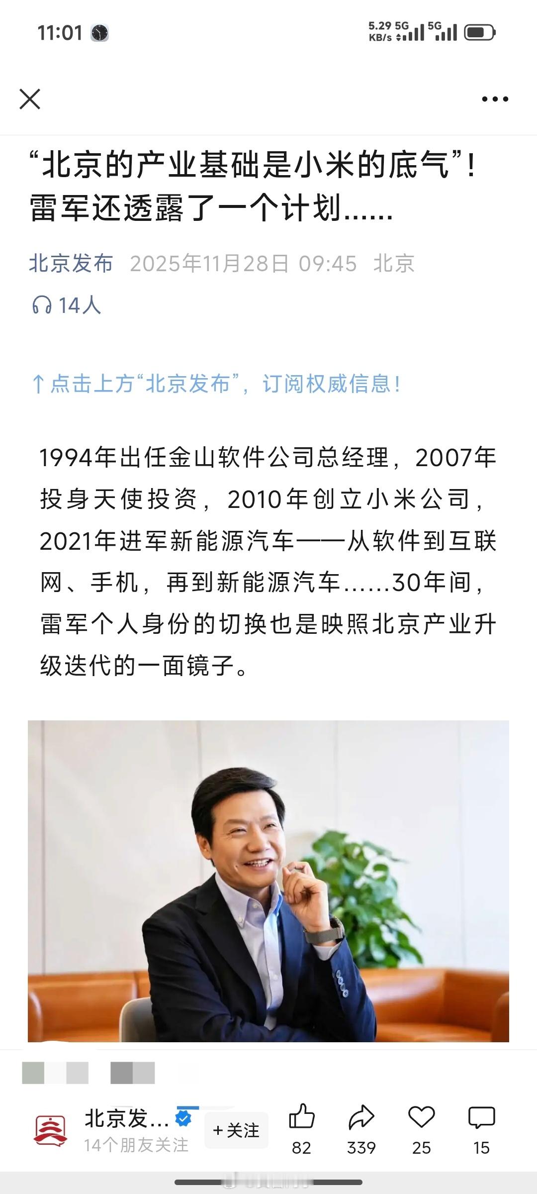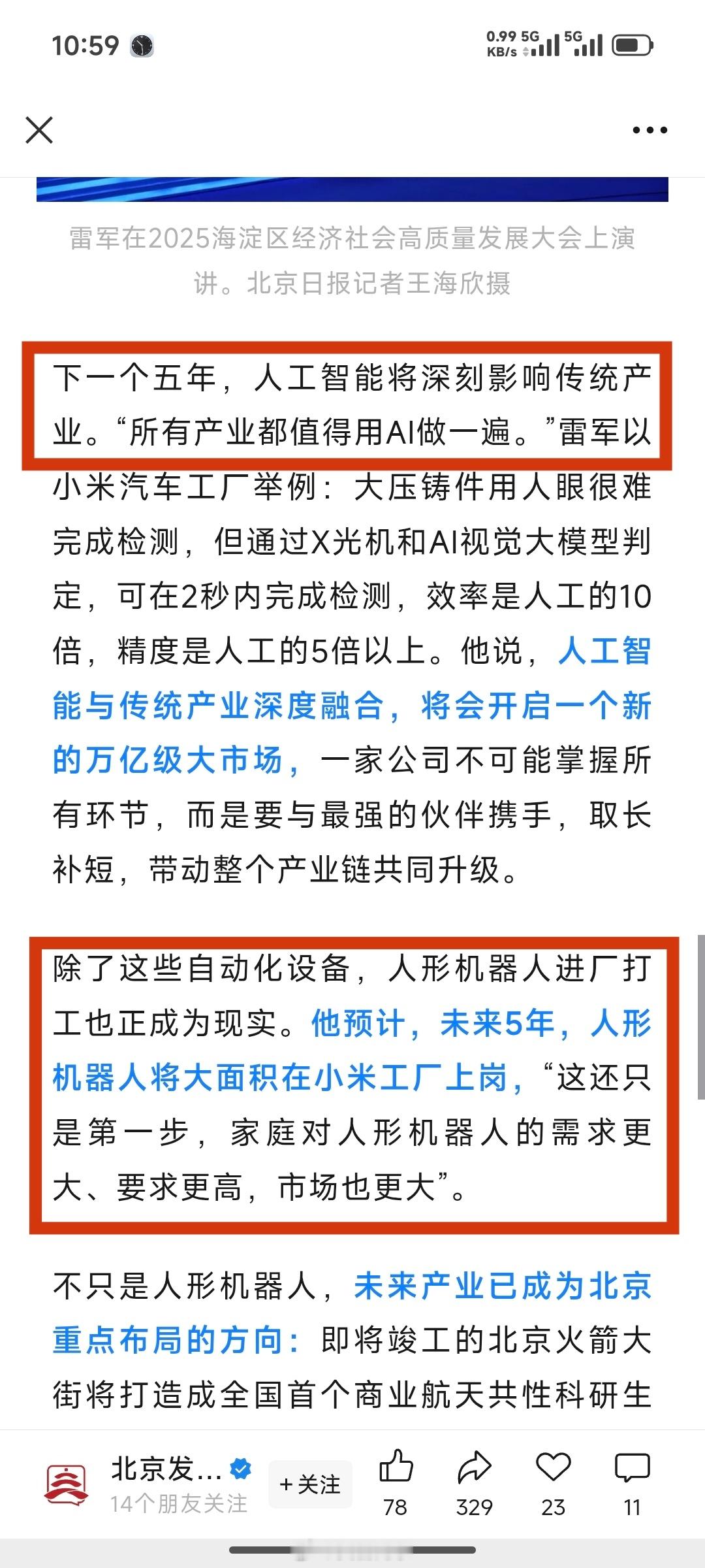 北京发布雷军:“北京的产业基础是小米的底气”“所有产业都值得用AI做一遍。”他预计,未来5年,人形机器人将大面积在小米工厂上岗Ai 和人形机器人! 这是小米下一个五年的新故事