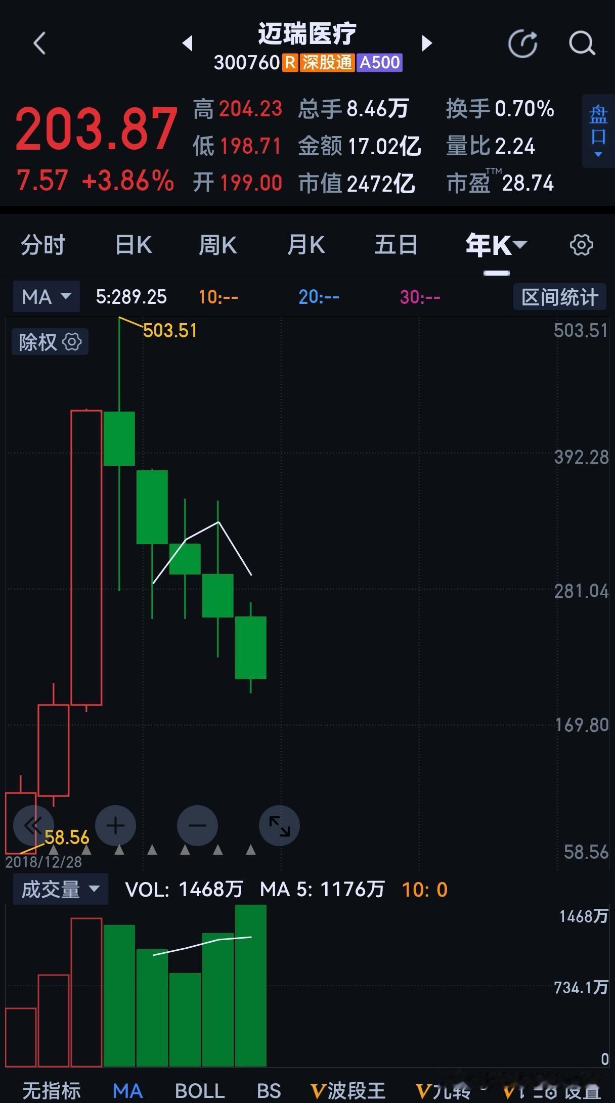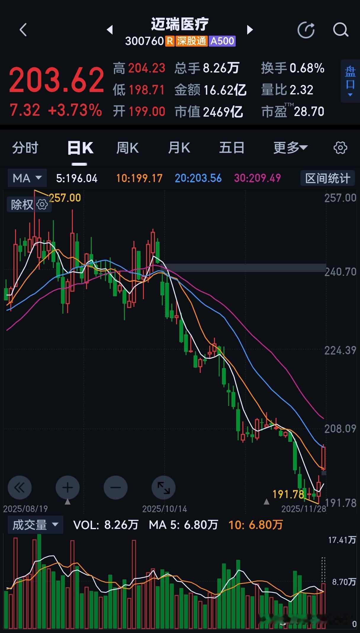 大股东增持股票,迈瑞医疗还会有低点买入机会吗? 昨夜,迈瑞医疗公告,公司实控人、董事长李西廷真金白银2亿元增持公司股份,实施期限6个月。 今天一早,很多持有迈瑞的朋友打电话给我说前两天股价底部(最低191.78元)没有补仓,现在大股东开始护盘了,是否可以补仓?关键是今天高开高走,股价最高已来到了204元之上,要买还得追涨。 面对年线5连跌,最近创下近5年新低191.78元的迈瑞,大股东出来维护股价,说明了管理层对当前股价被低估的认可。但趋势的力量是很大的,再加上这次反弹大概率是增持资金的作用,而机构等主力资金还没有进场。所以,迈瑞不会直接底部反转。大股东增持资金也不会“子弹一次性打出”,往往会采取分次托举式买入。否则,机构不进场,2亿资金用完了,股价再度下杀二次探底,那就很麻烦了。 综上所述,持有迈瑞想要补仓的,以及场外想进场的朋友们,大可不必心急,有的是低位机会。四季报之前,机构主力不会大肆进场做多,迈瑞还会底部确认或再创新低点,那时才是更好的补仓或进场时机。 最后声明:文中内容仅代表个人观点,不构成任何投资建议。股市有风险,入市需谨慎! 股市分析