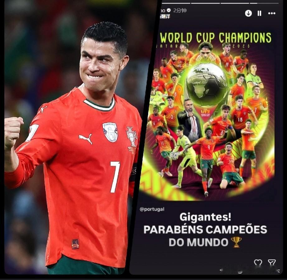 C罗机会来了? 2026世界杯,可能是葡萄牙超巨星C罗作为职业球员最后一届世界杯了,很可能世界杯结束,C罗宣布退出国家队,沙特联赛再踢2个赛季,完成自己1000球进球记录,宣布退役,然后加入葡萄牙国家队教练团队! 曾经葡萄牙的黄金一代,努诺戈麦斯、菲哥、鲁伊科斯塔,库托、若奥 - 平托、沙维尔、埃利奥·索萨夺得1989沙特世青赛,1991葡萄牙U20世青赛冠军,C罗都未能参与,如今的U17葡萄牙夺得U17世界杯冠军,感觉比黄金一代更强! 4年后,C罗可以作为葡萄牙主帅,带领这帮超黄金一代+C罗的儿子迷你罗,征战世界杯,有可能圆了C罗的世界杯冠军梦! U17世界杯 C罗