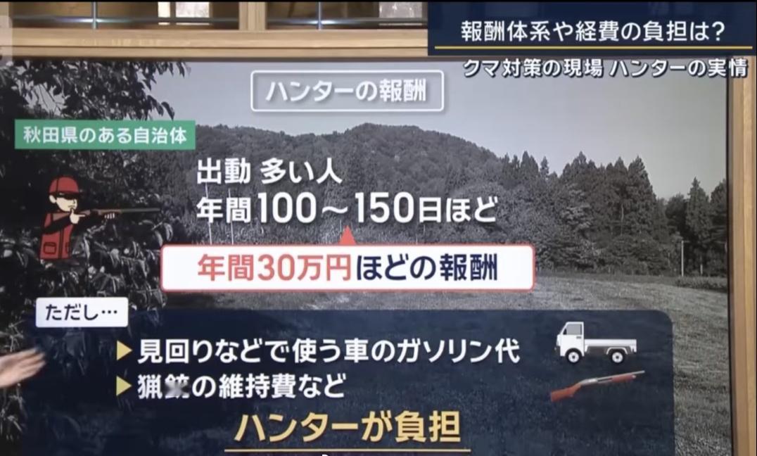 今年日本熊害严重,同时伴随熊猎人的老龄化严重,但没想到的是他们的待遇也是相当的哇塞…… 秋田县的相关自治体的在籍猎人, ▶️一年出勤天数150天,收入大概1.5万人民币 ▶️巡逻或者捕熊的时候,每天日薪大概130-150人民币 ▶️抓到熊的话,会奖励大概500人民币(按现在的汇率大概460元),但如果出勤5个人,则5个人来分这500人民币 ▶️抓到的熊解体作业得他们自己来,委托其他人没有额外费用支付 ▶️猎人需负担巡逻中使用车辆汽油费,还有枪支维护费什么的,没有其他补助哦
