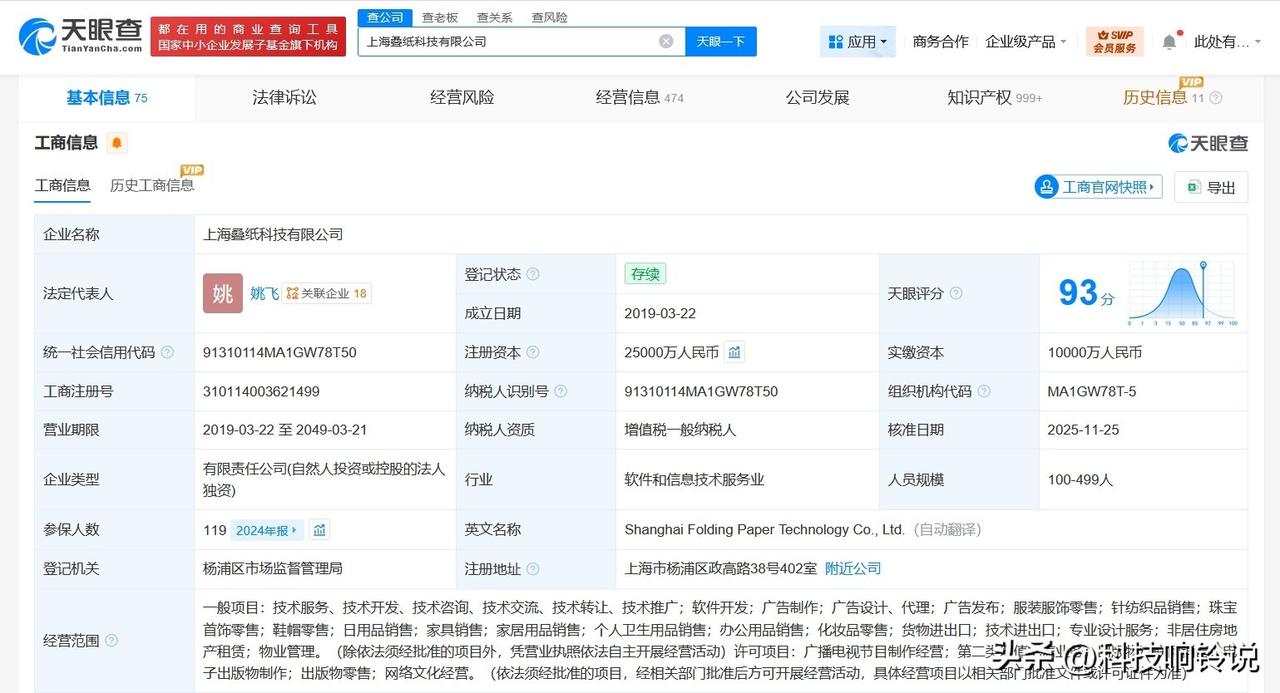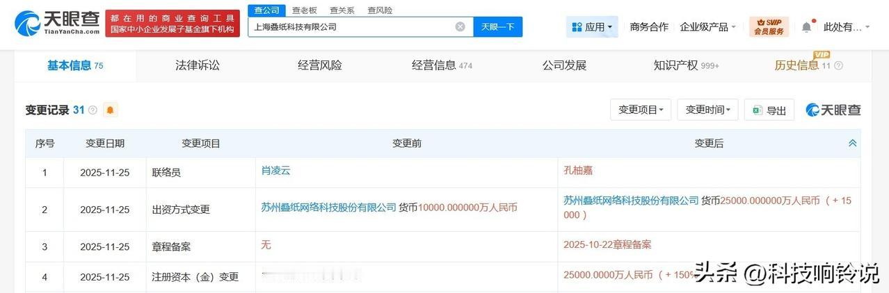 【上海叠纸科技公司增资至2.5亿 增幅150%】 天眼查工商信息显示,近日,上海叠纸科技有限公司发生工商变更,注册资本由1亿人民币增至2.5亿人民币,增幅150%。值得一提的是,今年10月,姚润昊卸任该公司法定代表人、执行董事,由姚飞接任法定代表人并担任董事。 该公司成立于2019年3月,经营范围含软件开发、广告制作、服装服饰零售、针纺织品销售、珠宝首饰零售、鞋帽零售、日用品销售、广播电视节目制作经营、网络文化经营等。股东信息显示,该公司由苏州叠纸网络科技股份有限公司全资持股。 天眼查信息: