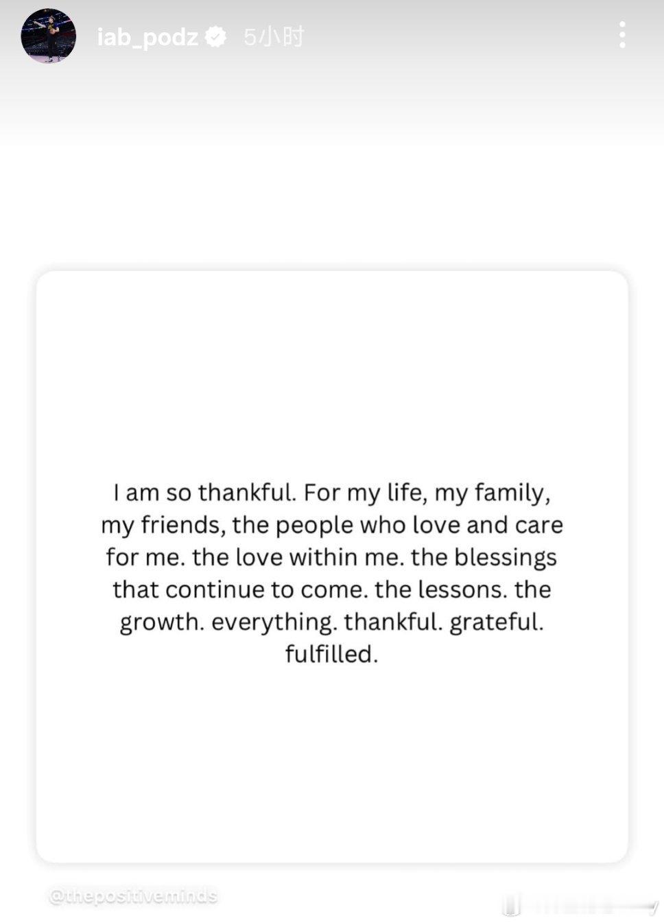 感恩节,波杰姆斯基转发一段正能量语录。我心怀感恩。感恩生命带我走过的每一步,感恩家人始终如一的陪伴,感恩朋友与我共享的每个瞬间。感恩那些爱我、照顾我、支持我的人,也感恩自己内心尚存的温柔与力量。所有降临的祝福、经历的磨练、收获的成长——都是礼物。此刻的我,感谢、感恩,也由衷地感到充实与满足。