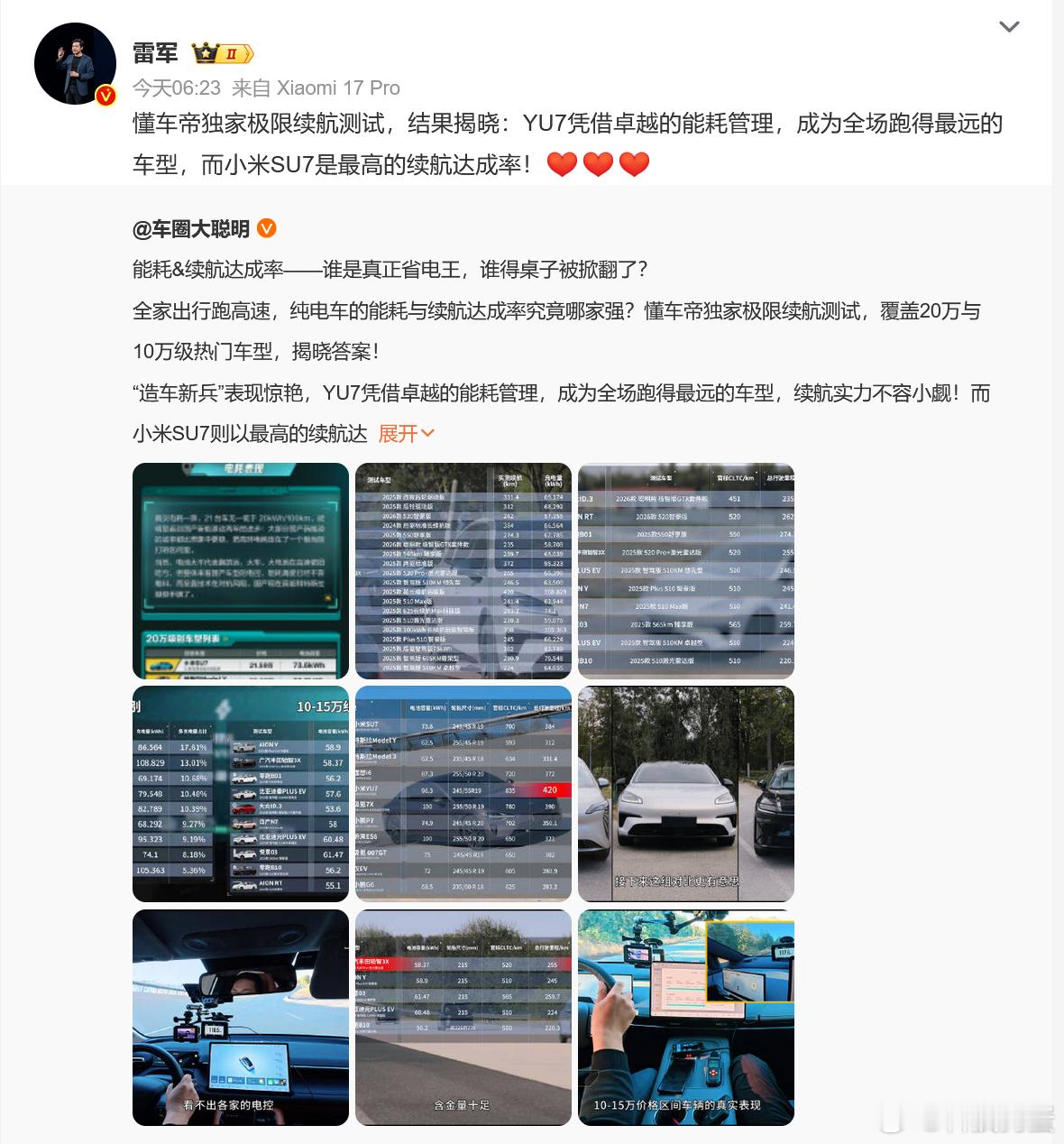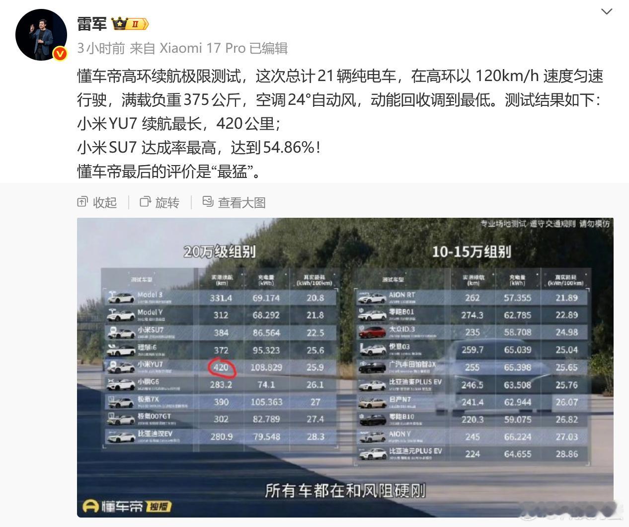 雷军回应小米汽车续航测试SU7和YU7能在懂车帝测试的21款车里拿下两个第一,尤其是续航和达成率双冠,足以证明小米在三电系统和能量管理上确实下了硬功夫。120km/h匀速跑、满载还开着空调,动能回收也调到最低,这种场景最考验真功夫,不是堆参数就能做到的。SU7作为纯电轿车,能把以能耗控制见长的特斯拉压过去,YU7作为SUV能跑出续航第一,这两项成绩含金量不低。最近小米舆 论环境不太好,我倒觉得某种程度上这反而是产品力的反向认证,当你动了别人的蛋糕,难免会面对各种声音,但最终能站稳的,永远靠的是技术沉淀和用户口碑。