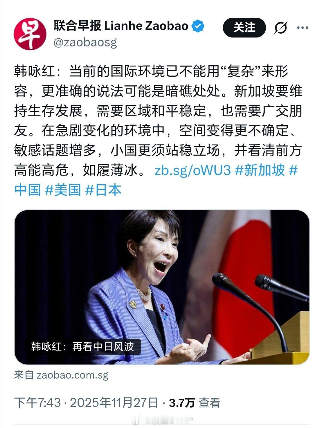 韩咏红:当前的国际环境已不能用“复杂”来形容,更准确的说法可能是暗礁处处。新加坡要维持生存发展,需要区域和平稳定,也需要广交朋友。在急剧变化的环境中,空间变得更不确定、敏感话题增多,小国更须站稳立场,并看清前方高能高危,如履薄冰。
