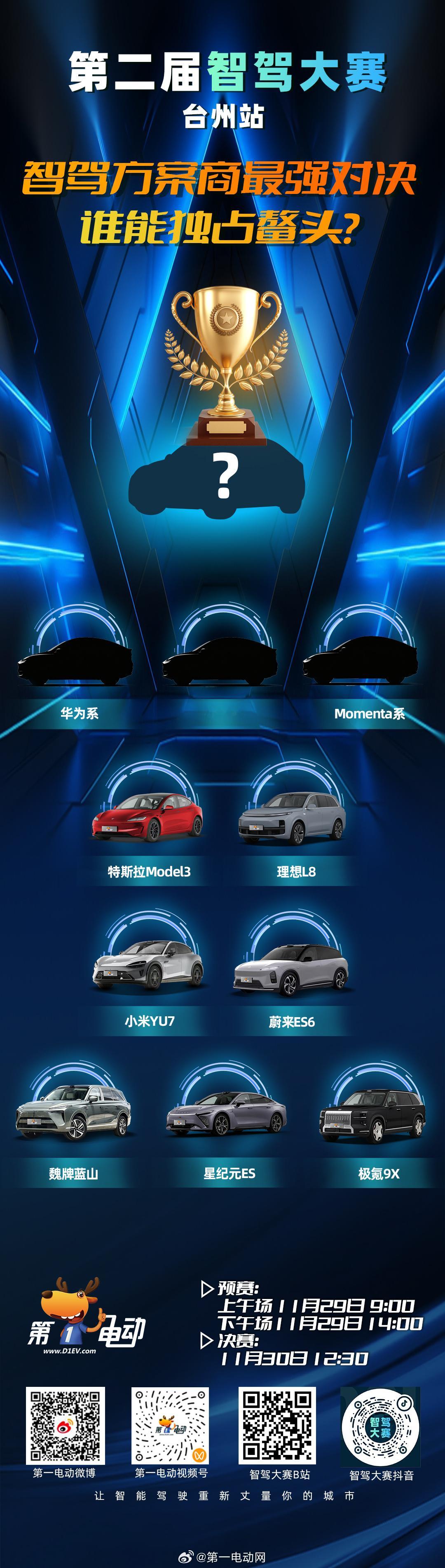 第二届中国智驾大赛台州站第二届中国智驾大赛 预热第五天|智驾方案商最强对决,谁能独占鳌头?三大方案车系晋级车型 + 七大品牌,全部集结完毕!三大方案派系预赛出线代表华为系:阿维塔、问界、智界、深蓝小鹏系:激光雷达G6 vs 纯视觉P7Momenta系:仰望、别克、腾势、智己三大派系,你更看好哪一家的技术路线?七大品牌再次正面交锋特斯拉 Model 3理想 L8小米 YU7蔚来 ES6魏牌 蓝山星纪元 ES极氪 9X十大车型,谁能在混战中突出重围夺冠?直播倒计时 1 天!转发 + 留言:说出你心中的“最强方案或车型”⏰ 直播时间:预赛:11月29日 9:00 & 14:00决赛:11月30日 12:30📺 直播平台:第一电动 微博 | 视频号智驾大赛 B站 | 抖音多位专业博主同步实况解说,直播间等你一起见证!👇 决赛未启,预言先行!评论区说出你的冠军。中国智驾战力天梯榜智能驾驶