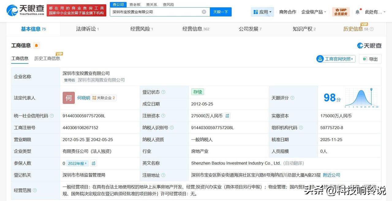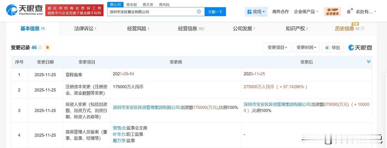 【深圳市宝投置业公司增资至27.5亿增幅约57%】 天眼查App显示,近日,深