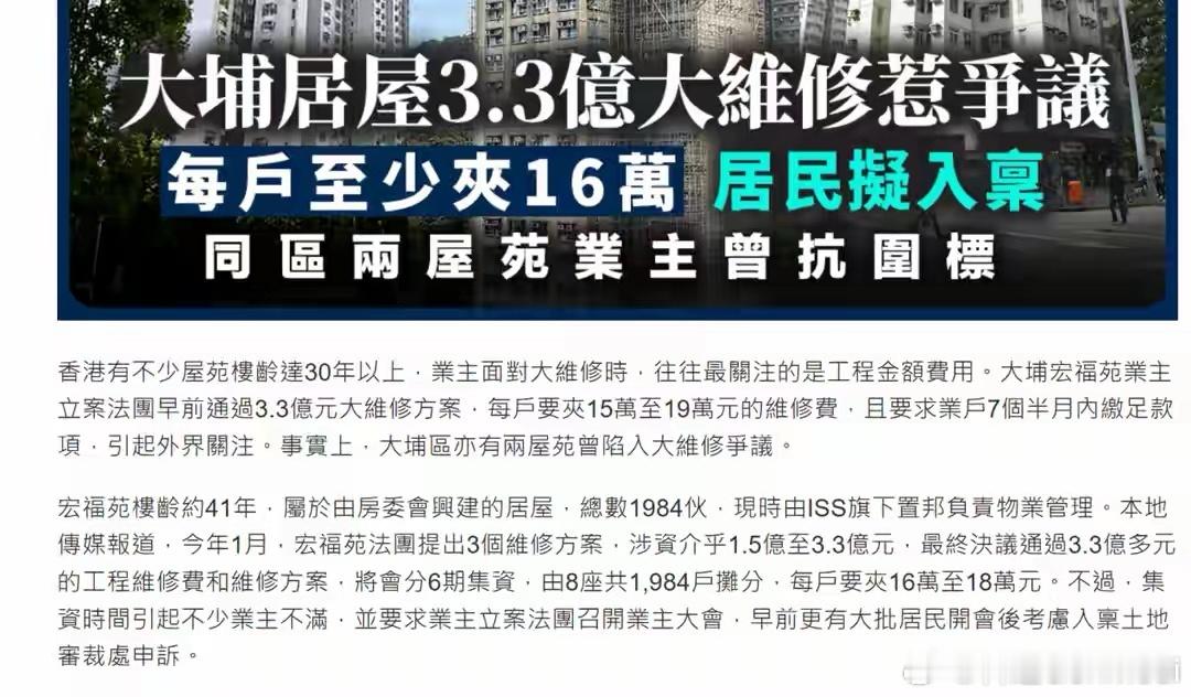 常洛闻:香港宏福苑大火,烧出两个利益江湖【文/观察者网专栏作者 常洛闻】11月26日,香港发生一起罕见的住宅区严重火灾,截至目前已证实遇难者超过90人,香港警方以涉嫌误杀罪拘捕负责维修大厦的工程公司三名负责人。警方在27日举行的记者会上表示,新界北总区重案组在消防灭火及搜救过程中,发现建筑物外墙的物料未符合防火标准。而且每一层电梯大堂窗外都有发泡胶包封,这种物料非常易燃,不排除是导致火势迅速蔓延的原因。警方已锁定一间负责维修工程并安装发泡胶的建筑工程公司,认为该公司的负责人严重疏忽,引发了这次火势一发不可收拾。但发泡胶(聚氨酯预聚体)可能只是原因之一。2024年,宏福苑居民曾向香港劳工处等部门致信,希望讲解棚网及工程安全。彼时劳工处回复称,前往现场视察认为“棚网发生火灾的风险相对较低”。宏福苑地处大埔,当天下午走水时就已烟火冲天,都已经在惊愕之余投入了对社区的自救和互助。不过这场灾祸的脉络,远不是香港不肯淘汰竹棚这么简单。房屋修葺背后的利益链首先要说说宏福苑这个名字。香港房屋分私营楼宇、公营房屋、丁屋三个大类。公营房屋由政府全部或部分资助,根据不同的历史、成本、供应方式,又大致包括了居屋、公屋两个大类。简单来说,两种公营房屋都由政府主导开发,开发过程可能以市场价承包给商业地产公司,政府出资填补差价。落成后公屋产权属政府,廉价租给合乎资格群体。公屋租金一般会占该住户每月收入约10%,租金包括管理费,无须补地价。一般以某某邨命名。公屋除无产权外,对租住业户收入、资产、持有物业、汽车、奢侈消费、跨国旅游等亦有监察,严格禁止闲置(丢空超过3个月)、转租、营业活动。虽然近几年也爆出多宗滥用公屋的个案,总体来说仍算有序,给大量底层民众解决了燃眉之急。居屋是“居者有其屋计划”(Home Ownership Scheme)简称,港房屋委员会兴建公营房屋,以廉价(市价五折)售予低收入市民,一般以某苑命名。宏福苑是大埔区最早期“居者有其屋计划”之一,由香港房屋委员会开发,1983年正式落成启用,共提供1900多户两房单位,发售时总价约在11.6万至15.9万港币之间。经过多年的发展,附近已经有成熟的交通、学校、生活配套。其中住户也逐渐高龄,根据香港政府2021年人口普查,当时共有4643名住户居住在宏福苑,其中65岁以上长者占比过半。而且囿于当时的设计建造要求和理念,以及地皮、基建等限制,宏福苑的设计在当时虽然是居屋的范本,现在看却已经相当过时,而且其塔楼结构形成了完整的对流结构,对火险相当敏感。由于有台风、暴雨等周期性自然灾害,无论公屋、居屋还是私人楼(商品房),都需要定期“验楼”、“验窗”,防止脱落的外立面、窗户零件伤及无辜。对于商品房来说,还能提高不动产价值,也避免大量的管理费“趴”在物业公司账上。强制验楼计划规定楼龄达30年或以上私人楼宇(不超过3层高的住用楼宇除外)的业主在接获屋宇署发出的法定通知后,须委任一名注册检验人员就楼宇的公用部分、外墙及伸出物或招牌进行订明检验。如该注册检验人员认为楼宇有需要进行订明修葺,业主须委任一名注册承建商,在一名注册检验人员的监督下进行所需的订明修葺。“强制验楼计划”至于“强制验窗计划”则规定楼龄达10年或以上私人楼宇(不超过3层高的住用楼宇除外)的业主在接获屋宇署发出的法定通知后,须委任一名合资格人士就楼宇的所有窗户进行订明检验。如该合资格人士认为窗户需要进行订明修葺,业主须委任一名注册承建商,在一名合资格人士的监督下进行所需的订明修葺。据立法会2014年公报,光是验窗,合资格人士就超过17000人,足以保证公平的市场化竞争。实际上相关行业有复杂的准入和严密的行会,所谓公平竞争,【 只能保证“有得拣”,不保证“有得平”】具体执行标准也并非铁板一块,围绕楼宇的兴建和维护,已经形成了层层嵌套的利益链条。可参考电视剧《大宅门》中,白景琦去当铺当貂皮袄的桥段。类似宏福苑这种面积,有4扇左右窗户的住房,就算仅做检查,不做任何加固,费用应该也在4000港币以上。这次宏福苑之所以大量竹棚和防护网紧贴在建筑外围,就是为了维修外立面,以满足楼宇安全要求。类似宏福苑这样的居屋,政府在转卖给业主后已经退出经营和管理,其物业管理现在由置邦物业管理有限公司(ISS EastPoint Property Management Limited)负责——置邦于1982年12月14日在香港成立,是专为宏福苑等政府居屋提供物业的公司。业主每个月缴纳的管理费,包括管理费和物业维修基金,比例大概是9:1,如果想动用这笔钱,需要业主法团召开大会,投票决定。一般来说需要取得投票业主简单多数,参与投票的业主需要超过总业主的半数以上,每个物业公司、业主法团都有细微区别。由于牵涉的款项往往巨大,业主利益分散甚至偶有冲突,不同户型、朝向的业主又有不同意见,这一投票过程可能持续数月甚至数年。宏福苑11月7日最近一次业主立案法团的会议记录,目前进行的大维修共进行了15期,总工程款为179894166元(1.8亿)港币。而且因应维修,整个屋苑(小区)在整年物业管理费收入1953万的情况下,2026年预计将会录得141万港币赤字。且这个天价维修费,只是总体工程款的不到一半,物业公司和业主法团通过的维修方案总额3.3亿元港币。