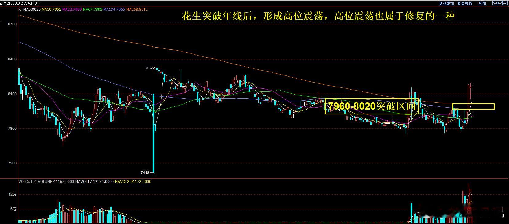 花生03突破7960-8020区间后,属于已经突破年线。现在运行上涨后的高位震荡,高位震荡也是属于上涨后的修复!花生期货