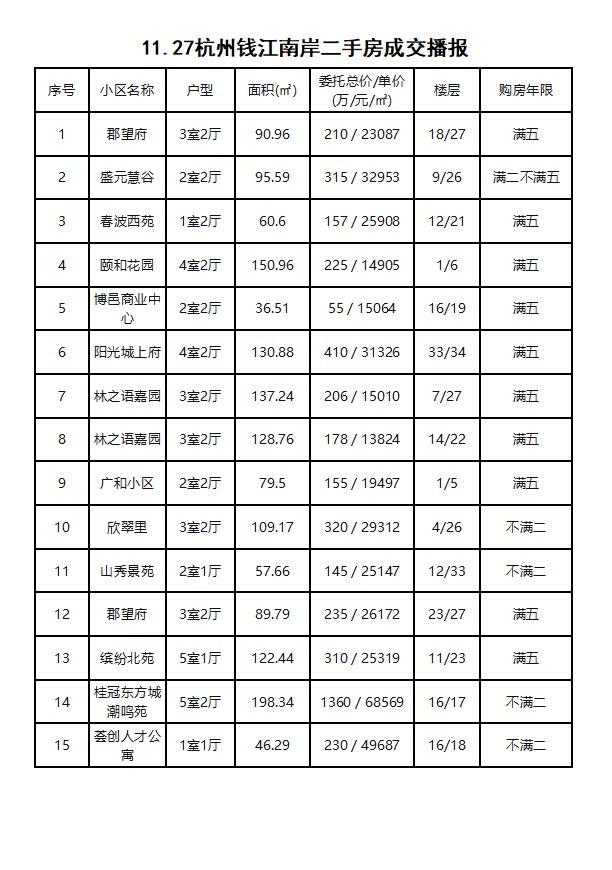 11.27杭州钱江南岸(滨江和萧山)二手房每日成交数据分享,昨日共成交16楼,成交量比较低迷,奥体世纪城呈现不少捡漏好房!杭州房产 杭州房产 杭州楼市 杭州二手房