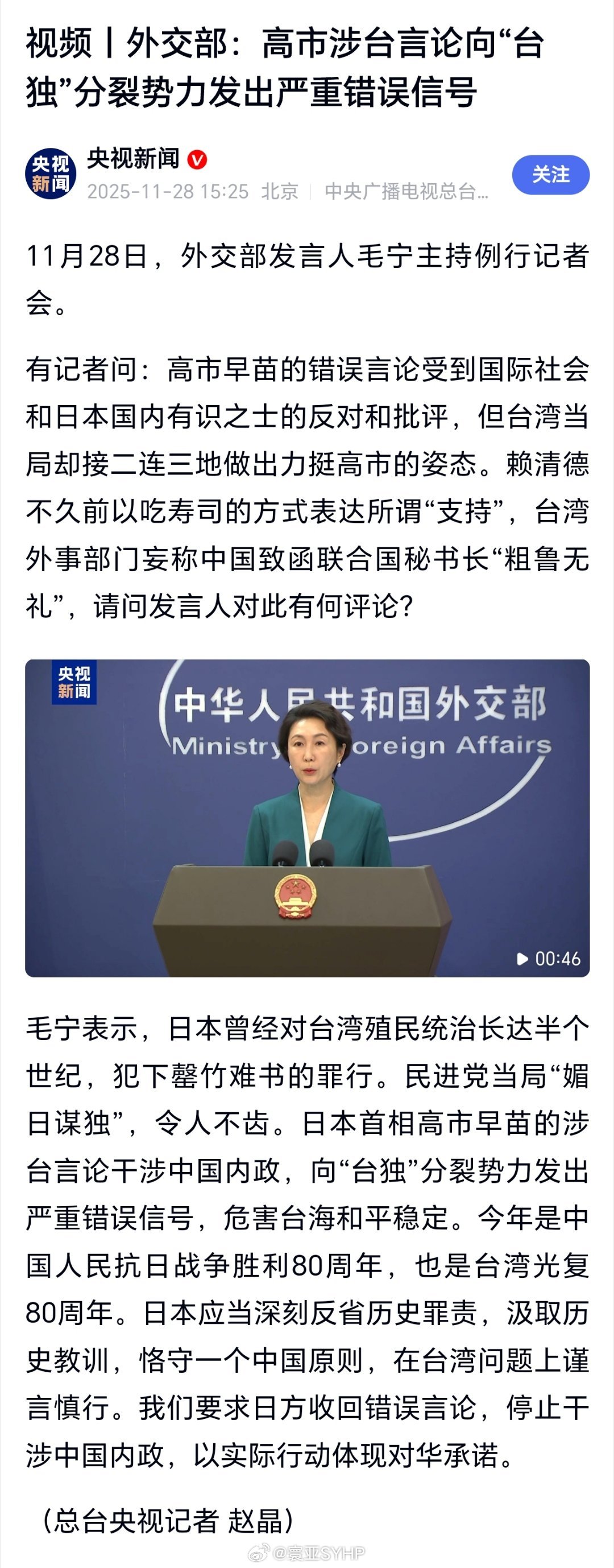 外交部:外交部:高市涉台言论向“台独”分裂势力发出严重错误信号要求日方收回错误言论外交部批民进党当局媚日谋独