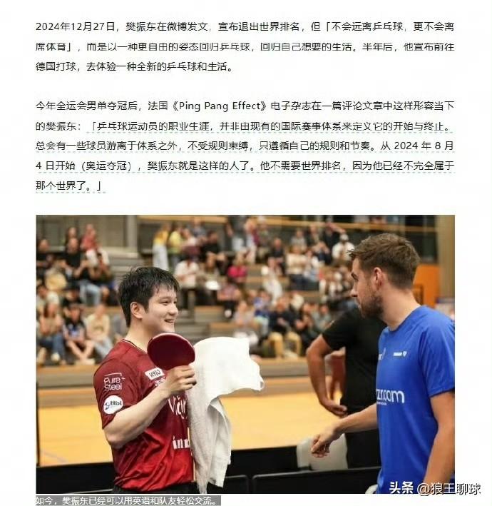 【法国《Ping Pang Effect》称樊振东不属于那个世界了】 樊振东28岁,已经是全满贯得主了,今年他没有进入国家队,那有怎样,国际乒联宣布规则对老将不够合理,他宣布退出世界排名。 没有进入国家队,樊振东选择前往德国打球,输球不可怕,可怕的是樊振东始终在思考“下一场要如何赢回来”。开启了在德甲的胜利之旅,他还在学习、升级,不断进化自己的武器库。 回到全运会——被称为地表最强乒乓球比赛,他先后战胜世界排名第一的王楚钦、世界排名第二的林诗栋夺得单打冠军,说什么都没用,战绩证明一切,樊振东归来仍是T0级选手。 法国《Ping Pang Effect》这样形容当下的樊振东:“乒乓球运动员的职业生涯,并非由现有的国际赛事体系来定义它的开始与终止。总会有一些球员游离于体系之外,不受规则束缚,只遵循自己的规则和节奏。从 2024 年8月4日开始,樊振东就是这样的人了。他不需要世界排名,因为他已经不完全属于那个世界了。”[赞][赞][赞][加油][加油][加油][给力][给力][给力][烟花][烟花][烟花] 在全新环境里找到新的成长可能,这就是樊振东德国之行的破与立。