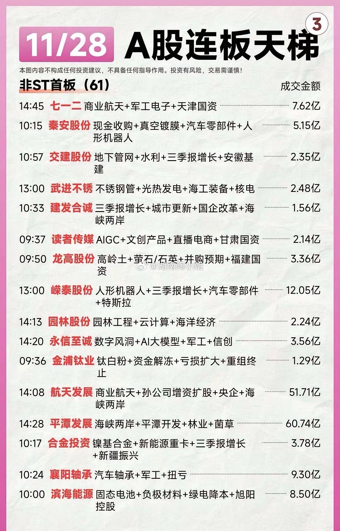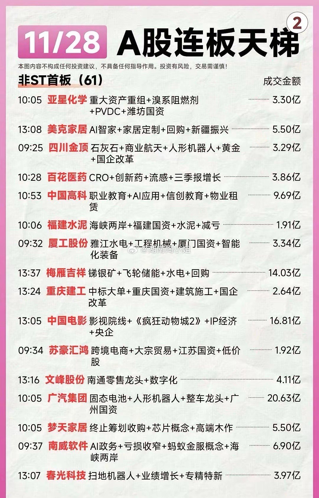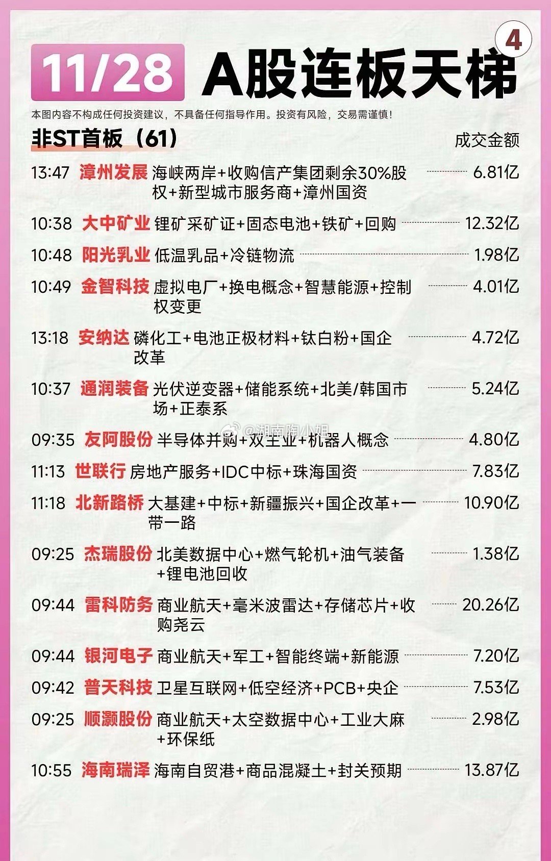 11月28日全A连板天梯个股梳理。A股连板热点速览:金富科技拟收购领涨,茂业商业、海王生物等跟涨,题材涵盖半导体、医药、零售。投资需谨慎。A股连板天梯:11/28强势股分析