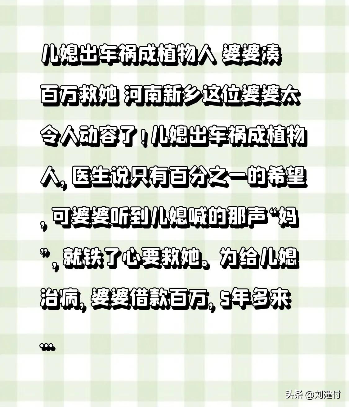 儿媳出车祸成植物人 婆婆凑百万救她 儿媳遇车祸 成了植物人 婆婆凑百万 一心把她救 河南新乡这婆婆 事迹真令人动容 儿媳车祸成植物人 医生说仅有百分之一的希望 但婆婆听到儿媳喊“妈” 便铁了心要救她 为给儿媳来治病 婆婆借款达百万 5年多来不离开 洗脸刷牙背着她 2020年儿媳车祸后 多处骨折还开颅 深度昏迷四月多 婆婆始终不放弃 如今儿媳状况好 这是爱的大奇迹 儿子也没弃爱人 一家人不离不弃 网友说得确实对 这才是真正婆媳情 不是母女胜似母女 婆婆行动诠释母爱无私 儿媳妇重病,婆家有义务出钱么 家有植物人,为夫,你会如何?