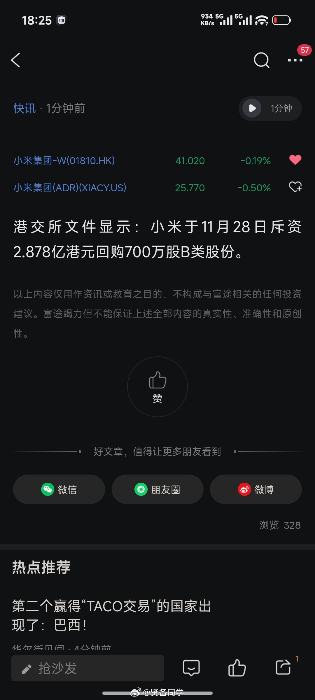 【米东快讯】港交所文件显示:小米于11月28日斥资2.878亿港元回购700万股B类股份。