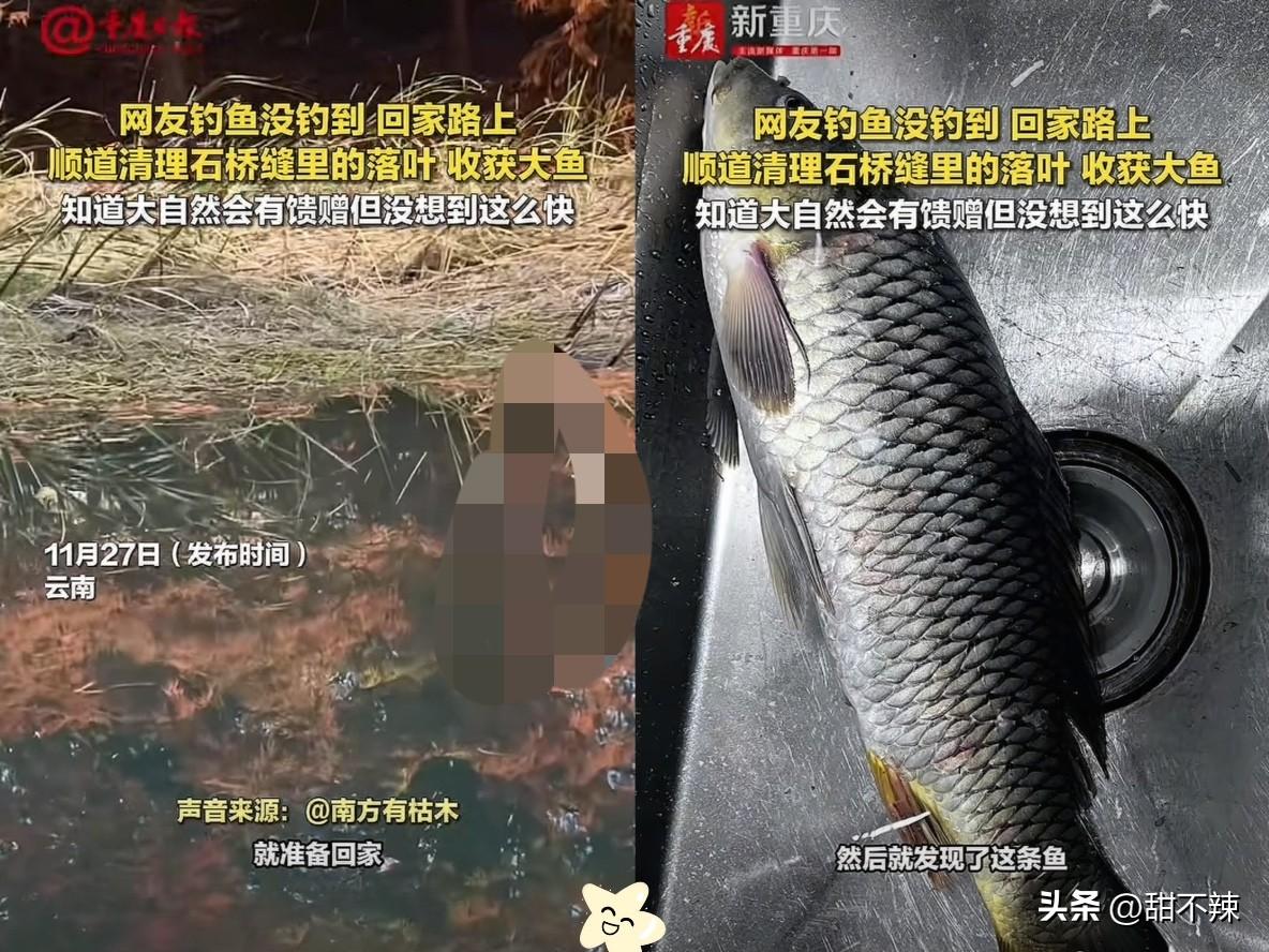 “这就是命!”云南,一女子去河边钓鱼,结果一条都没钓到,正准备空军回家时,路过石桥时瞥见树叶堵得水漫石面,顺手伸手清理了几下,没成想石缝里竟藏着条肥硕大鱼,直接拎着战利品笑开了花。 网友打趣她“不讲钓鱼佬武德”,但这事儿哪是捡漏那么简单?她清理桥洞从没想过要图啥,只是单纯觉得堵着碍事,这份不带功利心的随手善举,才是惊喜找上门的密码! 生活总爱开这种“反转玩笑”:越盯着目标死磕越容易碰壁,反而那些没放在心上的小善意、小坚持,常会悄悄递来彩蛋! 就像有人顺手帮邻居代收快递,后来竟收获了珍贵的友谊;有人坚持分享干货,意外得到了认可与机会! 善意从不是无用功,它更像生活埋下的“惊喜盲盒”,你永远不知道哪次随手的温暖,会换来意想不到的回馈!