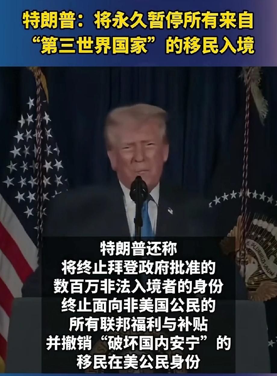 特朗普称将暂停“第三世界国家”移民 特朗普这波操作够狠啊!当地时间11月27日,他在社交媒体宣称要无限期暂停“第三世界国家”移民。他说要终止拜登时期非法入境者的入境许可,结束给非美国公民的福利补贴,取消破坏安宁移民的公民身份,驱逐有负担和风险的外国人。 美国公民及移民服务局也配合行动,无限期暂停阿富汗公民移民申请处理,重新审查19个“受关注国家”绿卡持有者。这或许和白宫附近两名国民警卫队成员被阿富汗公民枪击有关。特朗普这一系列举动,真不知会给美国移民政策和国际关系带来啥影响。