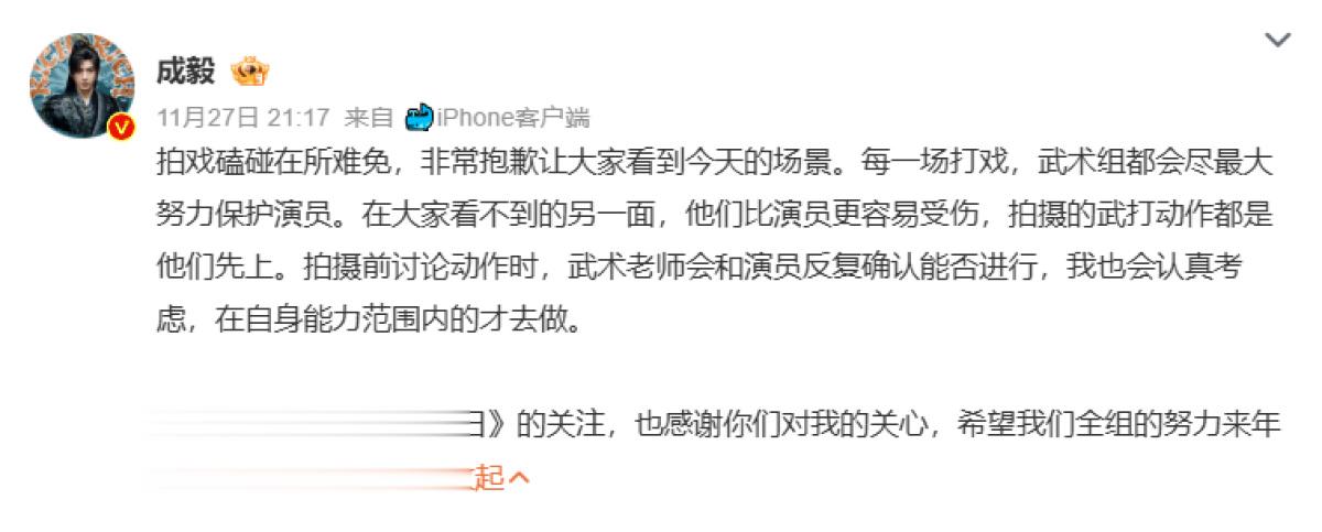 11月27日,网传视频显示,知名男演员成毅在拍戏时疑似后脑勺触地。不少成毅粉丝要求剧组重视安全问题,引发广泛关注。当晚,成毅发微博回应受伤,表示“拍戏磕碰在所难免”。