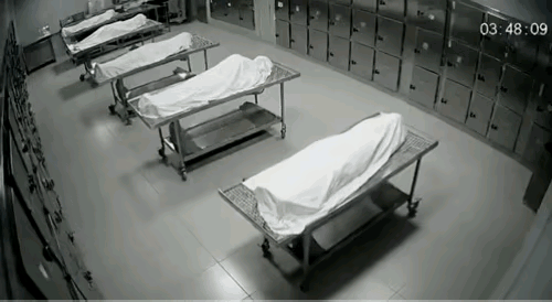 好吓人![发怒] 殡仪馆,恐怖的一幕! 视频中,两侧是集成冰柜,中间是单人推车,四个人形物上面盖着白布,配上幽暗的光线,冰冷的氛围,这里是殡仪馆停尸房无疑。 下面划重点,为什么这个推车会自行移动,看着挺吓人的。 推车应该是不锈钢材质,台面边缘高,平面上布满小孔,四个腿上有滑轮,这种设计主要为了尸体冲洗中,水不向四周溢出,又可以快速排走。 尸体从浴室冲洗后,全身湿漉,不会直接放入冰柜,需要擦拭、沥水、晾晒后才可入柜,否则尸表有冰碴子影响遗容,更重要是尸体会和冰柜冻在一起,以后不好拉出来。 了解以上程序,推车四个轱辘沾水,地面湿滑,尸表水分蒸发等一系列因素,导致推车重心偏移,偶然中的必然,从而出现视频中一幕,您认为有道理吗?